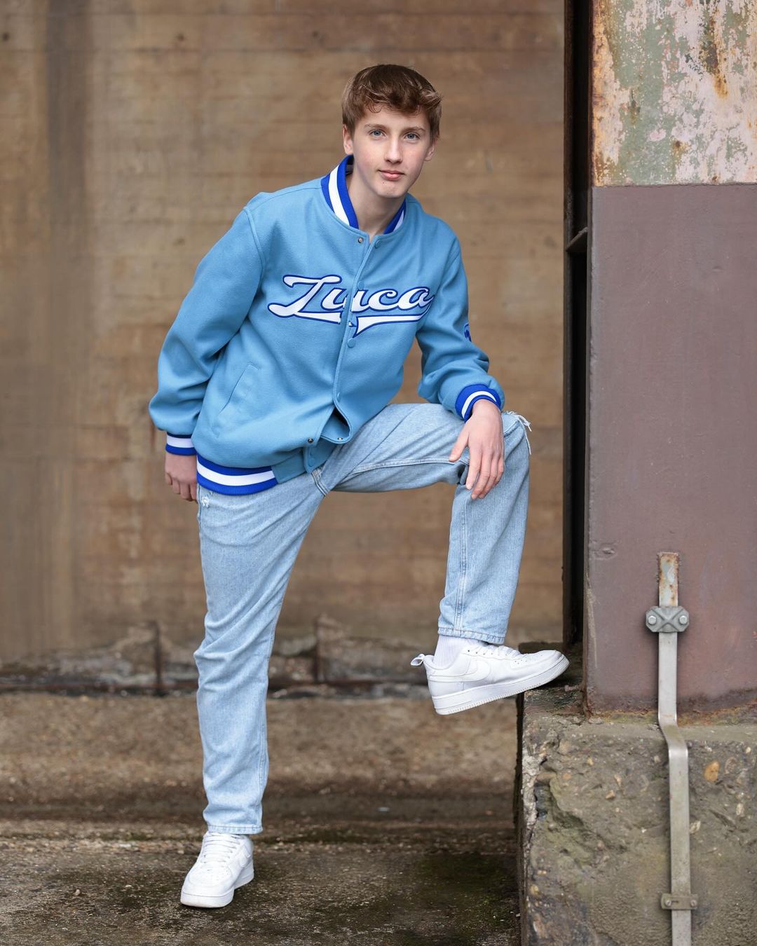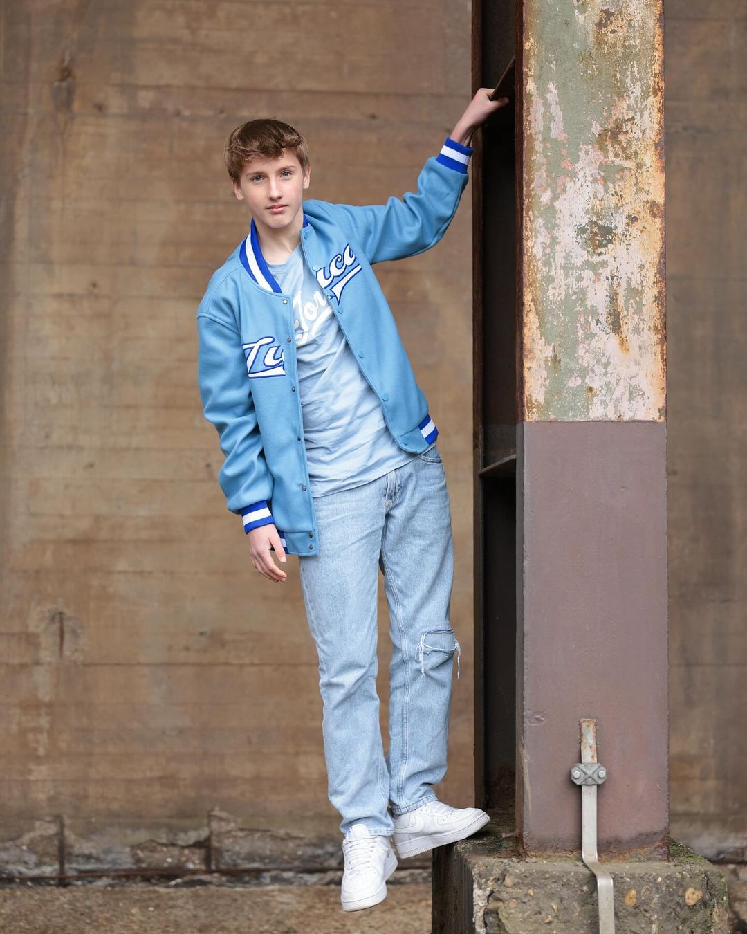 Customized blue jacket paired with blue jeans and white sneakers for fun in abandoned factories