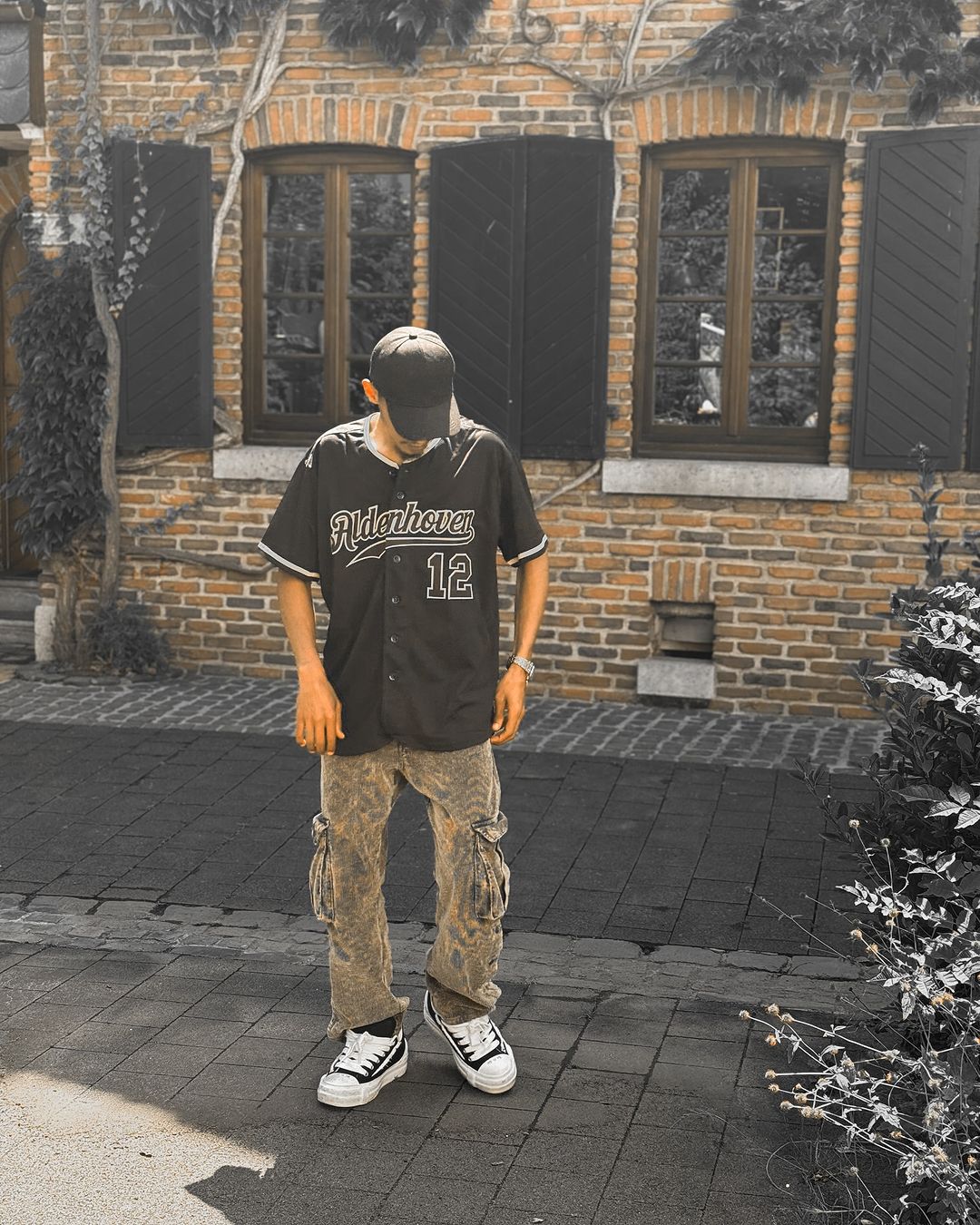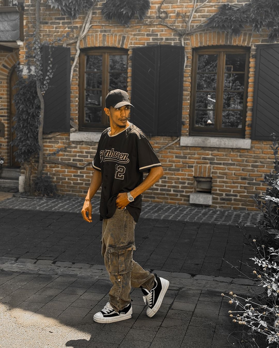 Short distance travel wearing black custom baseball jersey with black hat and sneakers