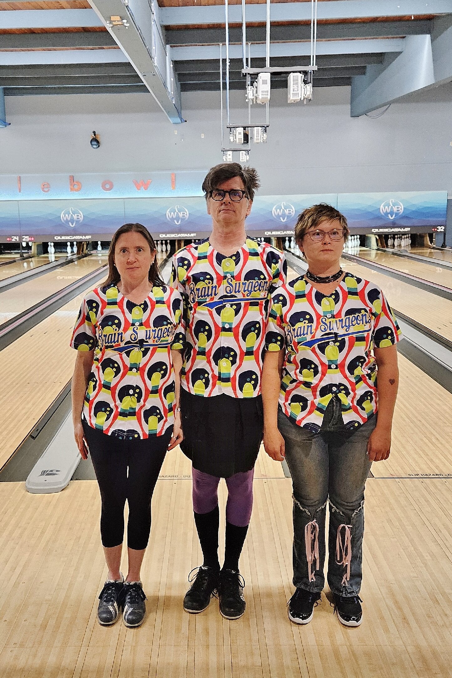 The team is playing in a bowling alley wearing custom baseball jerseys with bowling patterns