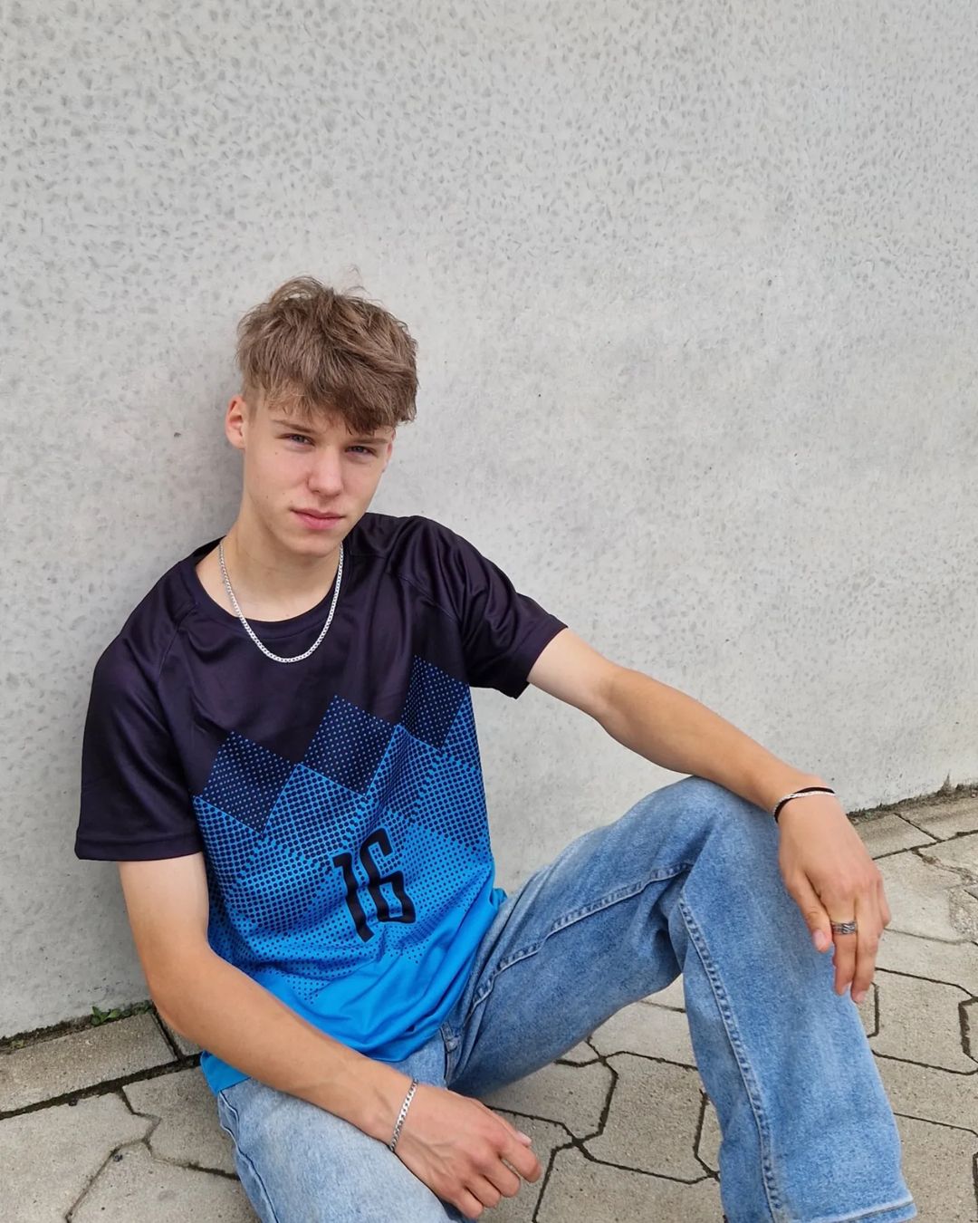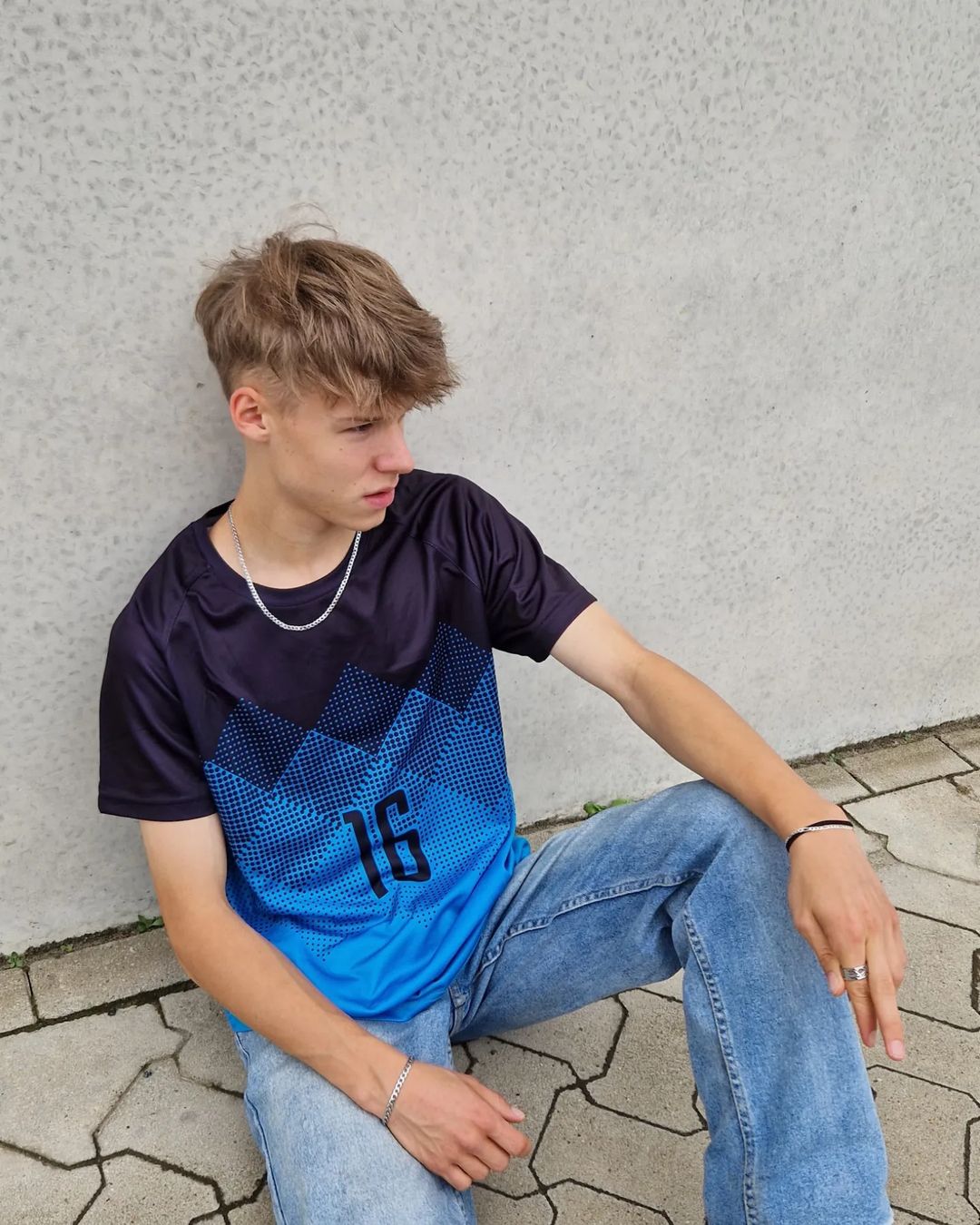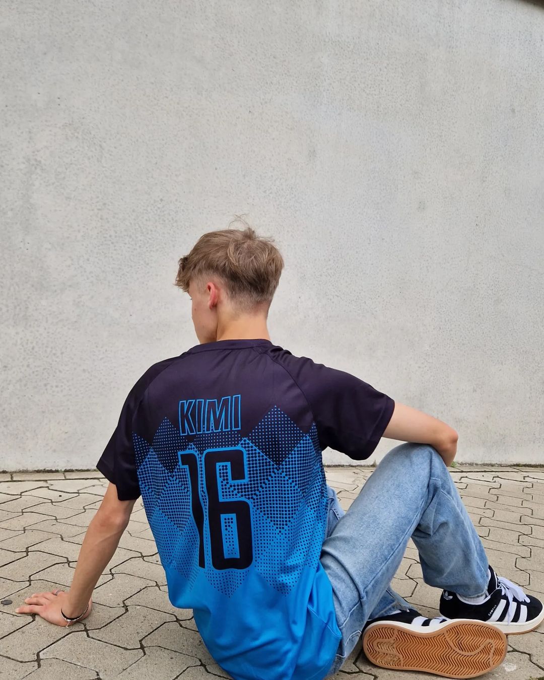 Wear a custom-made soccer jersey with blue and black checkered stripes, paired with jeans and sneakers