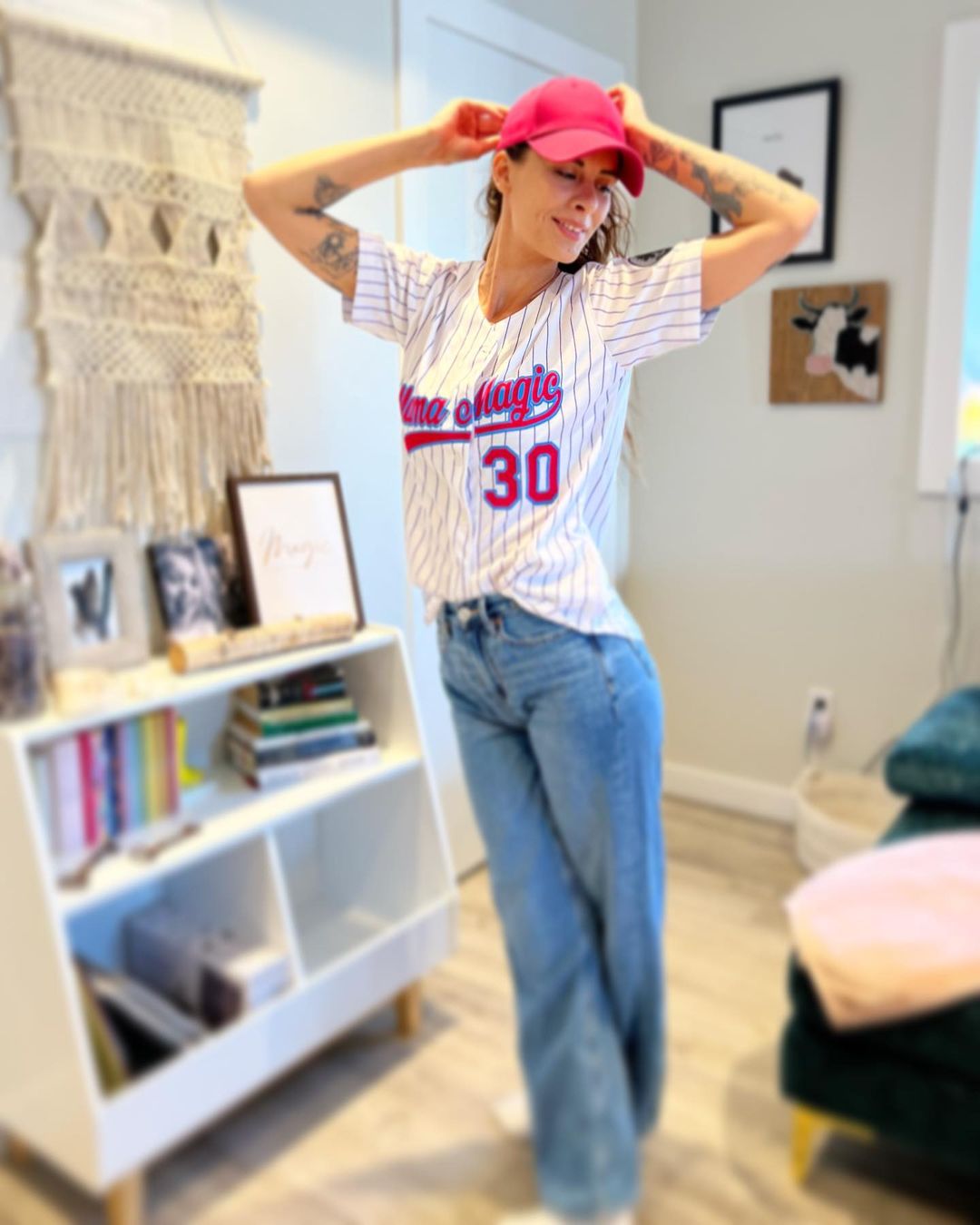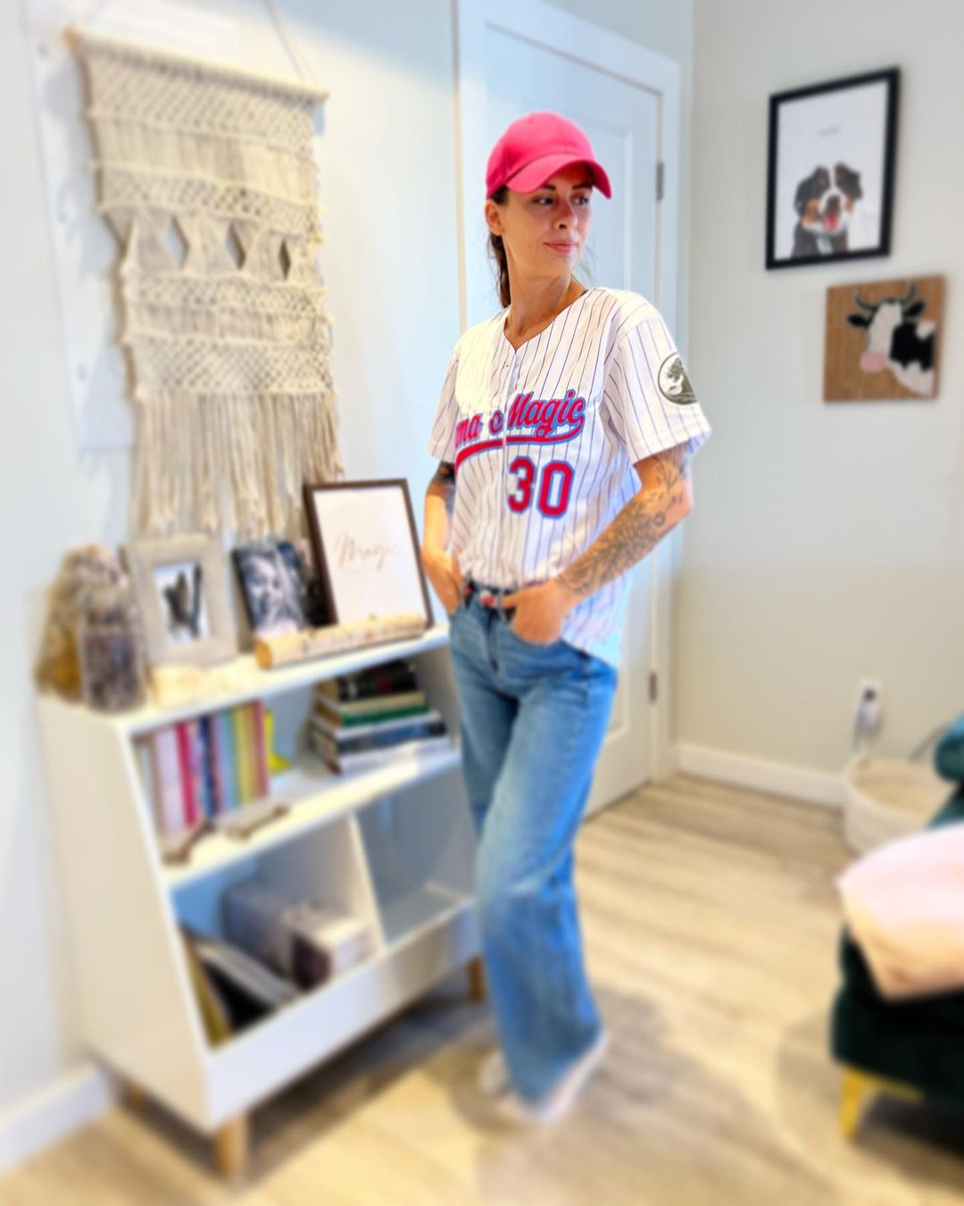 Wearing a custom baseball jersey with a logo, baseball cap, and jeans in the study room