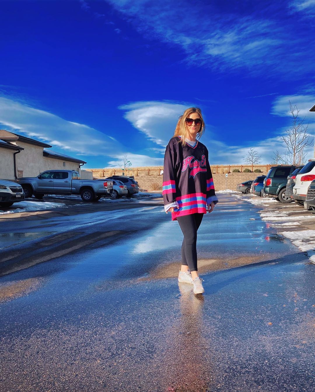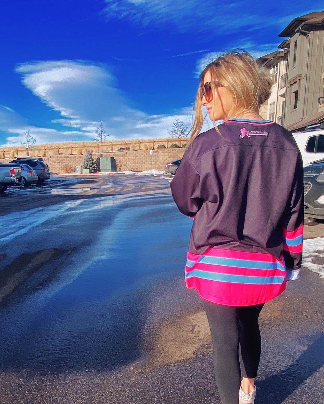 Wearing women's black custom ice hockey jersey on a clear day after snow