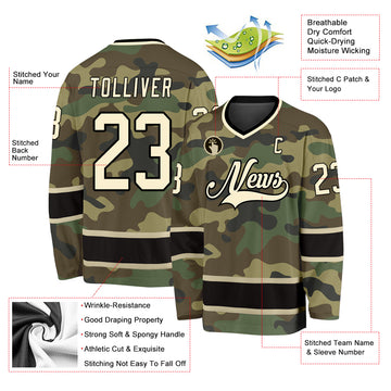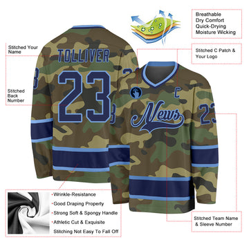 Customized hockey camo jerseys have a wide and diverse range of usage scenarios. Here are some common scenarios and their matching suggestions: Usage scenarios: Formal matches: In ice hockey leagues or tournaments, teams usually wear a unified customized jersey to demonstrate team cohesion and professionalism. These jerseys are usually exquisitely designed, brightly colored, with the team emblem and player names printed on them. Friendship matches and training: In friendship matches or daily training, teams may also wear customized jerseys to facilitate identification between teammates and reflect team spirit. These jerseys may be relatively simple, but they still reflect the team's characteristics. School and club activities: School or club ice hockey teams may also choose custom hockey camo jerseys to showcase their identity and team culture. These jerseys are usually combined with school or club logos to showcase a unique style. Special events: When celebrating specific holidays, anniversaries, or hosting special events, teams may choose custom hockey camo jerseys to highlight the theme and atmosphere of the event. Suggested color matching: The color of the jersey should match the team's logo and theme, while considering the visual effect of the player on the ice, a bright and high contrast color combination can be selected. Accessories and Details: Details such as team emblem, player name, and number can be added to the hockey camo jerseys to highlight the personality of the team and players. Meanwhile, suitable collar, cuffs, and hem designs can be chosen to enhance the aesthetics and comfort of the jersey. Protective gear and equipment: Matching protective gear and equipment with custom hockey jerseys is also crucial. The leg guards, elbows, helmets, etc. should be coordinated with the style of the jersey to form a unified visual effect. Socks and shoes: Players' socks and shoes are also part of their overall attire. You can choose socks that match the color of the jersey, as well as professional ice hockey shoes, to ensure the comfort and safety of players during the game. Accessories and props: In special occasions or events, it is also possible to consider adding some accessories and props, such as scarves, hats, gloves, etc., to increase the richness and fun of the overall design. In short, there are various usage scenarios and flexible matching methods for customizing ice hockey jerseys. The key lies in selecting appropriate colors, details, and accessories based on the characteristics and needs of the team, in order to showcase the unique charm and team spirit of the team. Camo Black, Camo Light Blue, Camo Navy, Camo Orange, Camo Purple, Camo Red, Camo Royal, Camo Vintage USA Flag