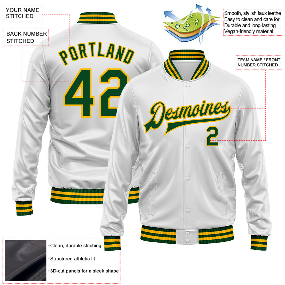 Custom White Green-Gold Bomber Full-Snap Varsity Faux Leather Letterman Jacket