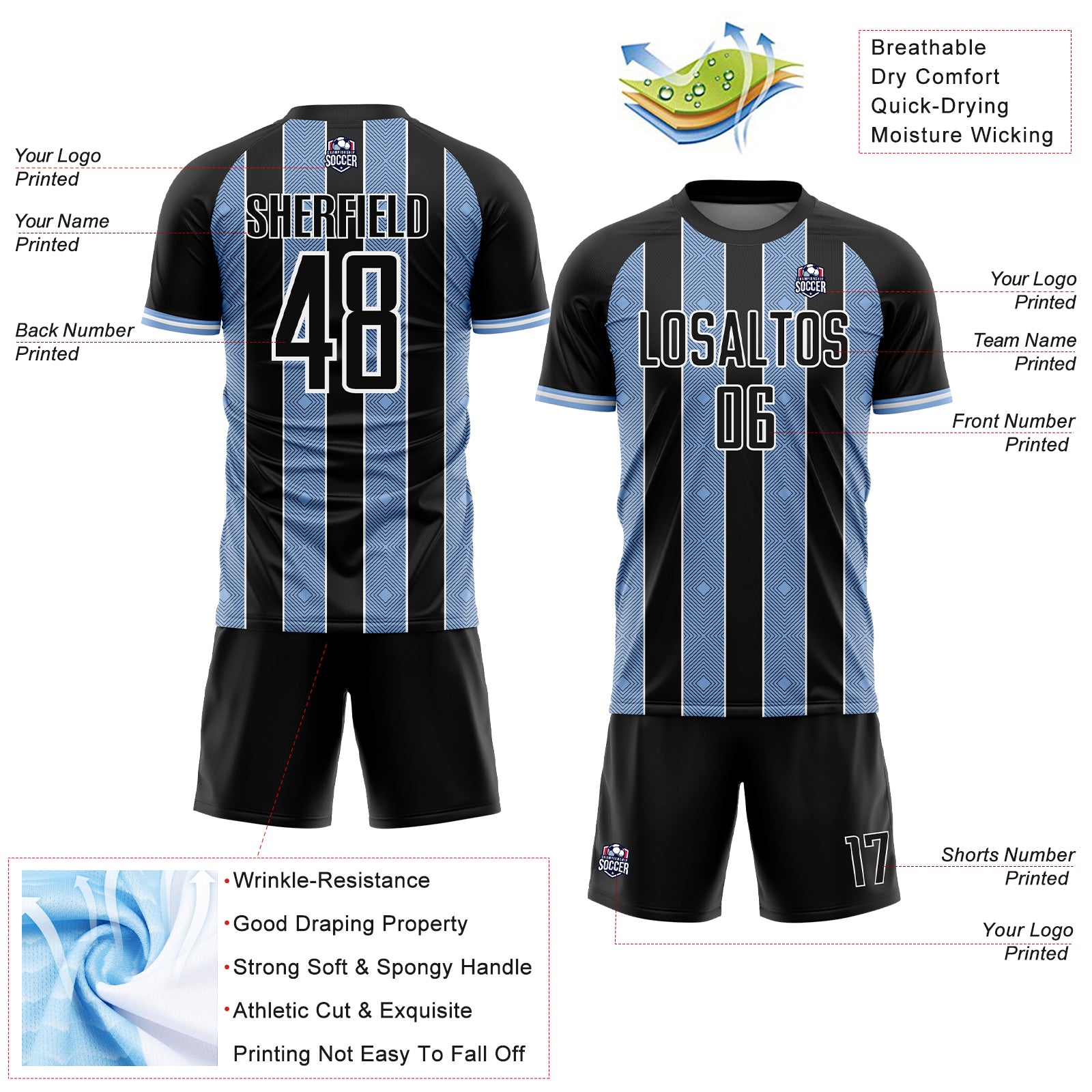 Custom Black Light Blue-White Pinstripe Line Sports Sublimation Soccer Uniform Jersey
