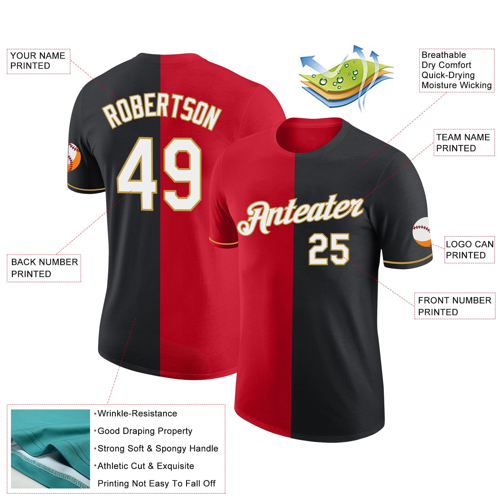 Custom Black Red-Old Gold Split Fashion Performance T-Shirt