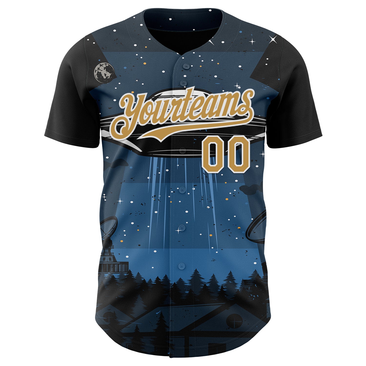 Custom Blue Old Gold Black-White 3D Pattern Design Alien UFO Galaxy Authentic Baseball Jersey