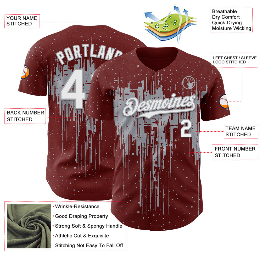 Custom Burgundy White-Gray 3D Pattern Design Dripping Splatter Paint Authentic Baseball Jersey