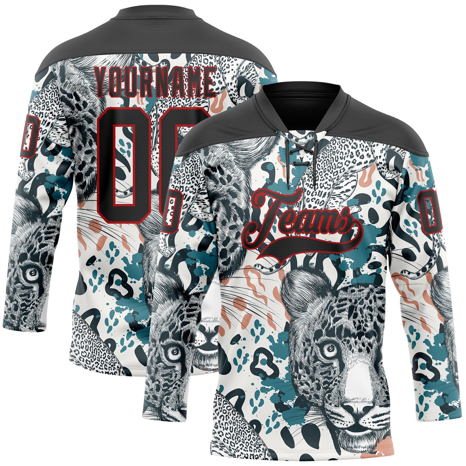 Custom White Black Blue-Red 3D Pattern Leopard Hockey Lace Neck Jersey