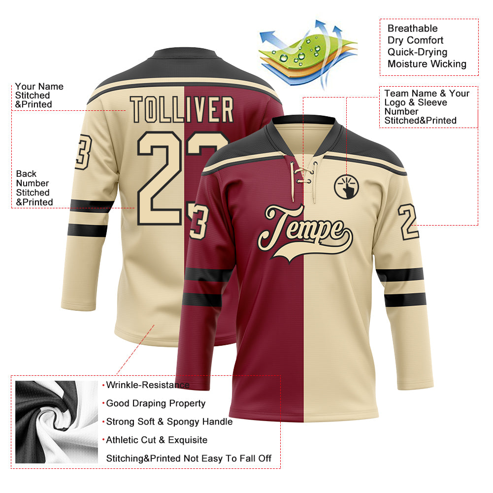 Custom Cream Crimson-Black Split Fashion Hockey Lace Neck Jersey