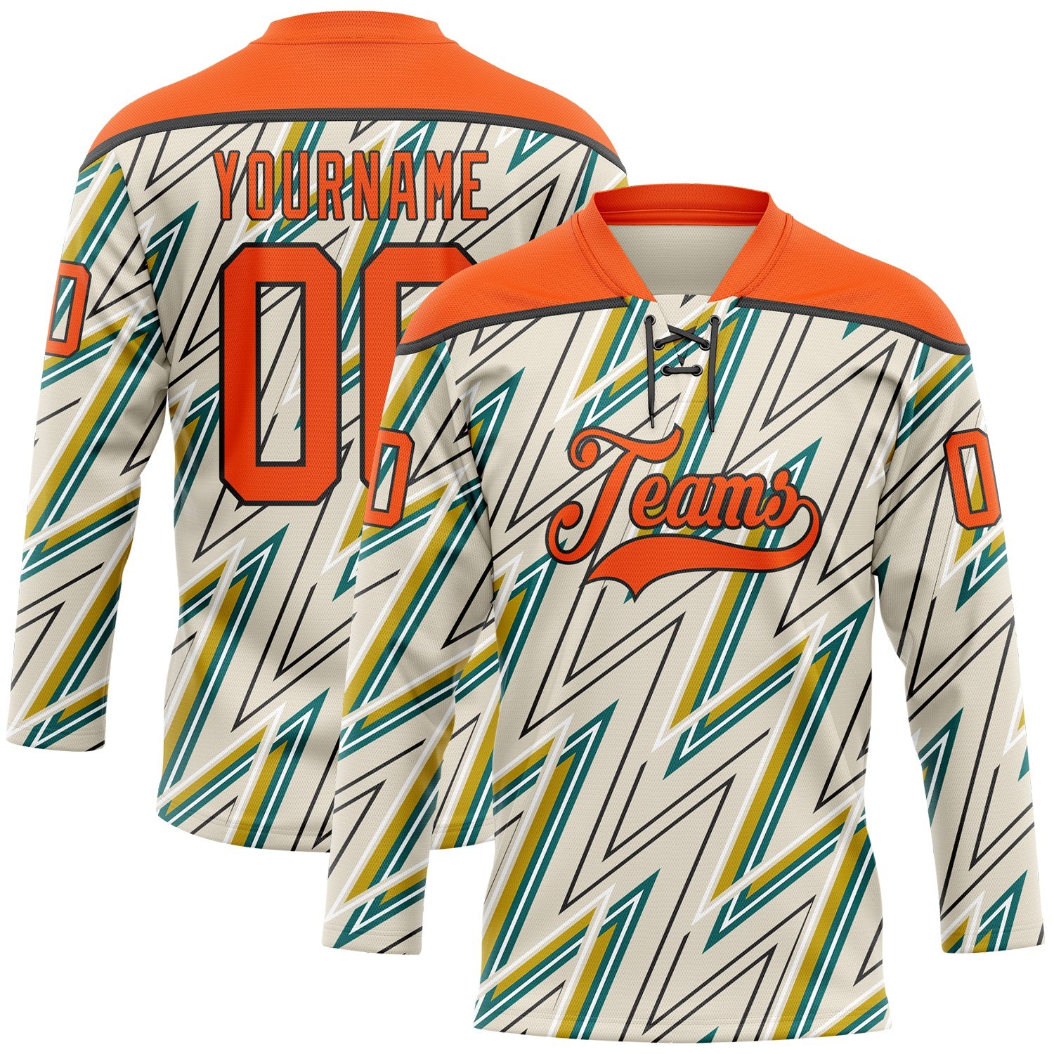 Custom Cream Orange Green Yellow-Black 3D Pattern Lightning Hockey Lace Neck Jersey