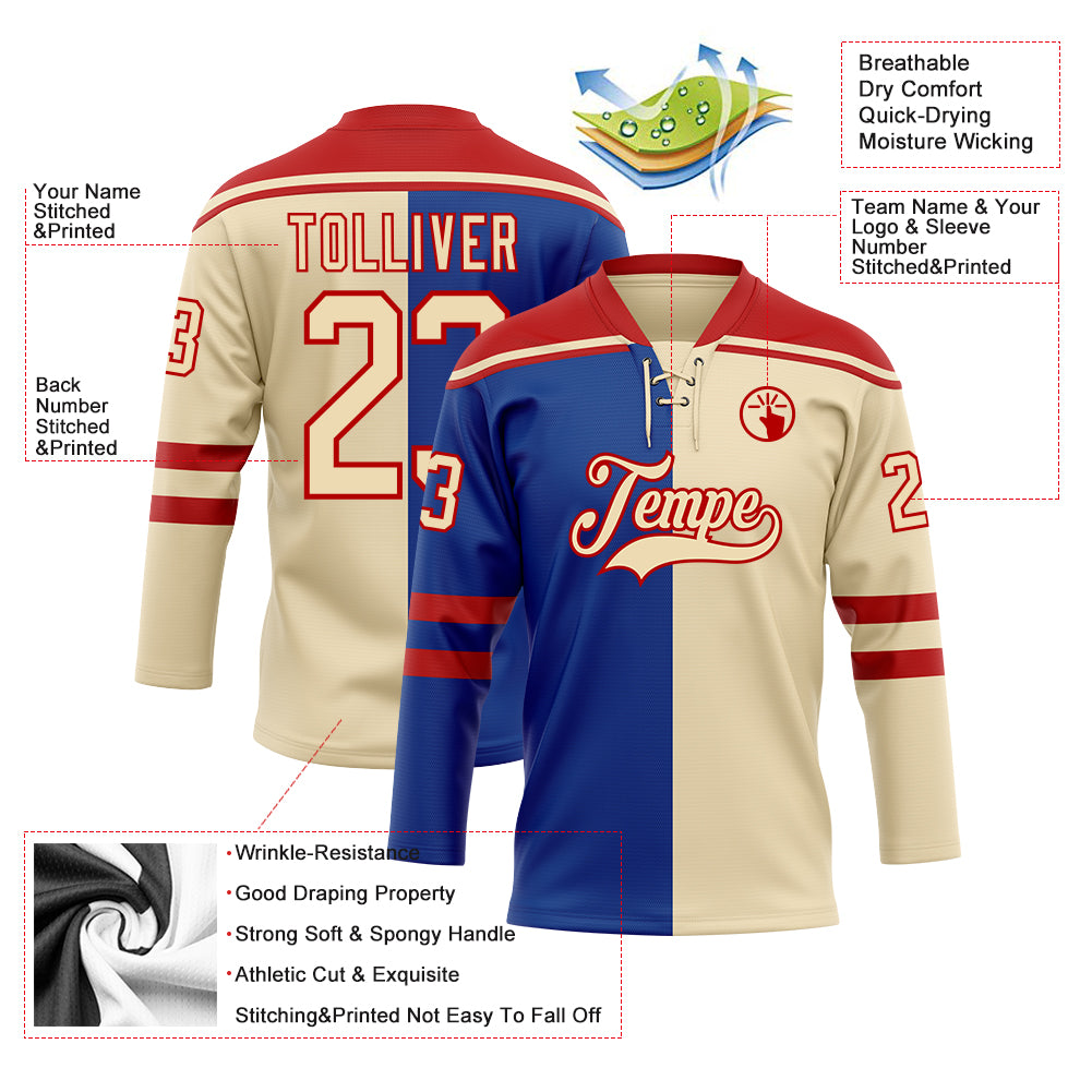 Custom Cream Royal-Red Split Fashion Hockey Lace Neck Jersey