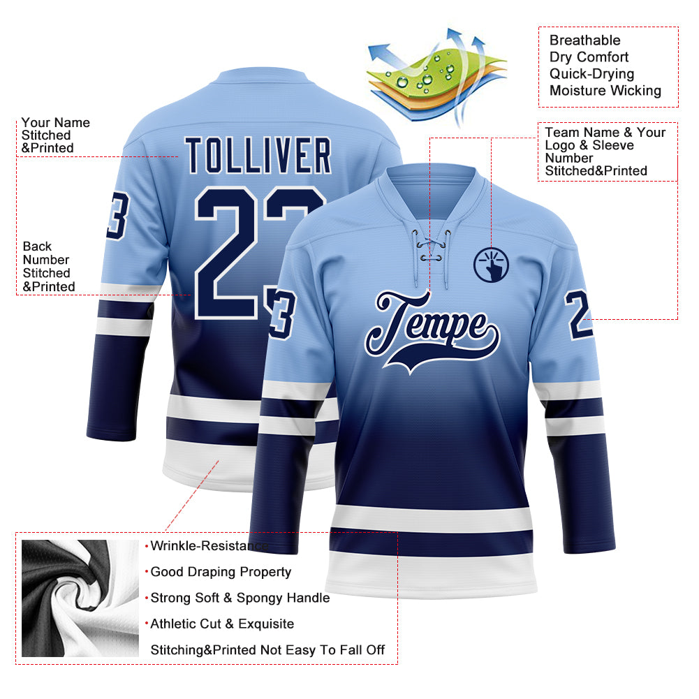 Custom Light Blue Navy-White Fade Fashion Hockey Lace Neck Jersey