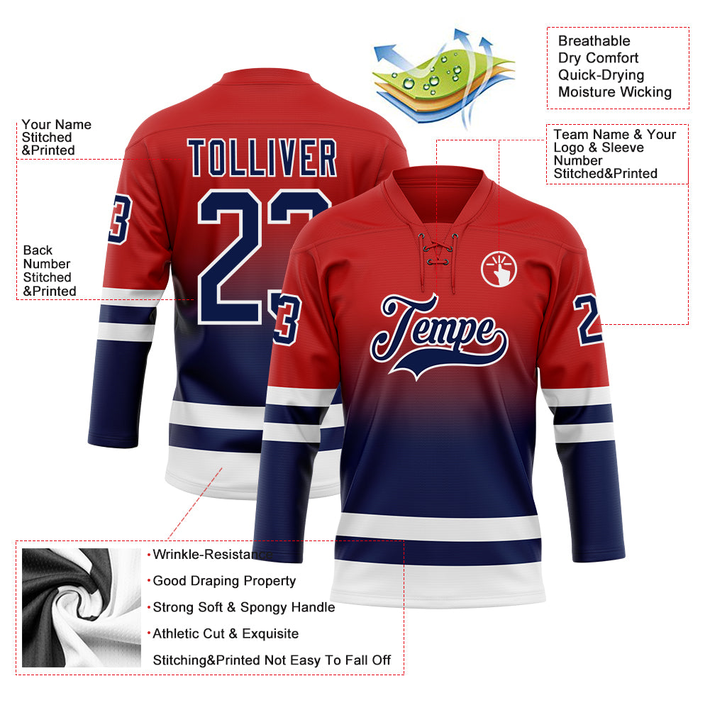 Custom Red Navy-White Fade Fashion Hockey Lace Neck Jersey
