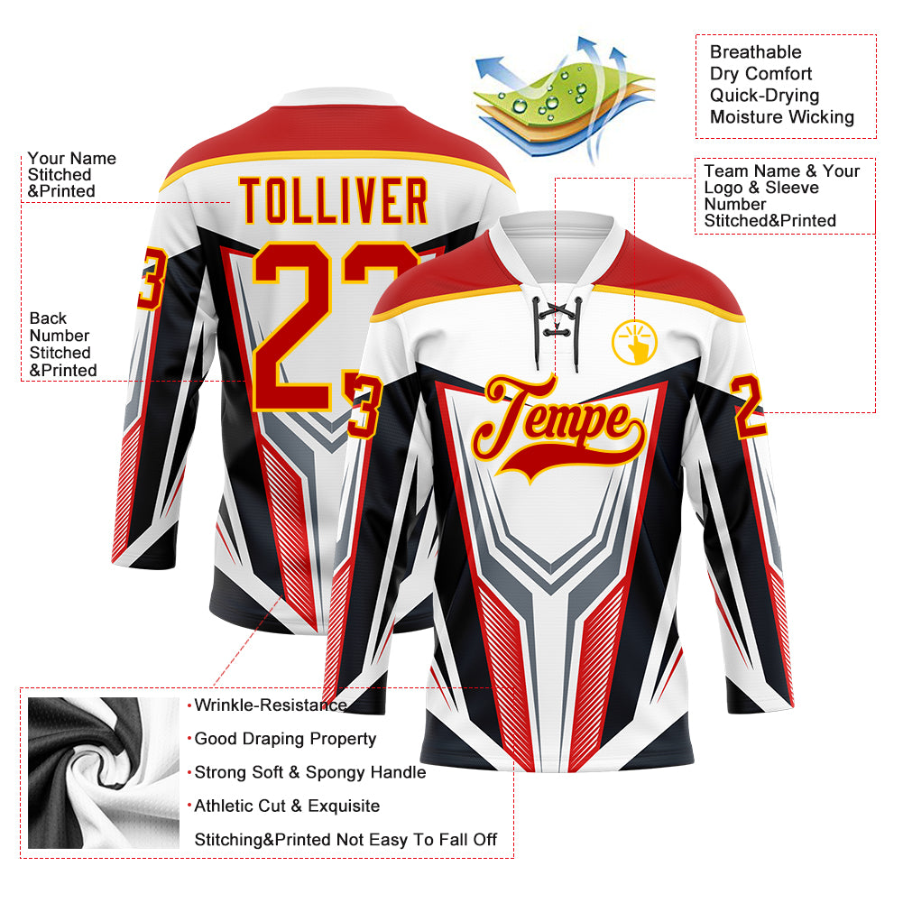 Custom White Red Yellow Black Gray-White 3D Abstract Pattern Graphic Cyber Mecha E-sport Hockey Lace Neck Jersey