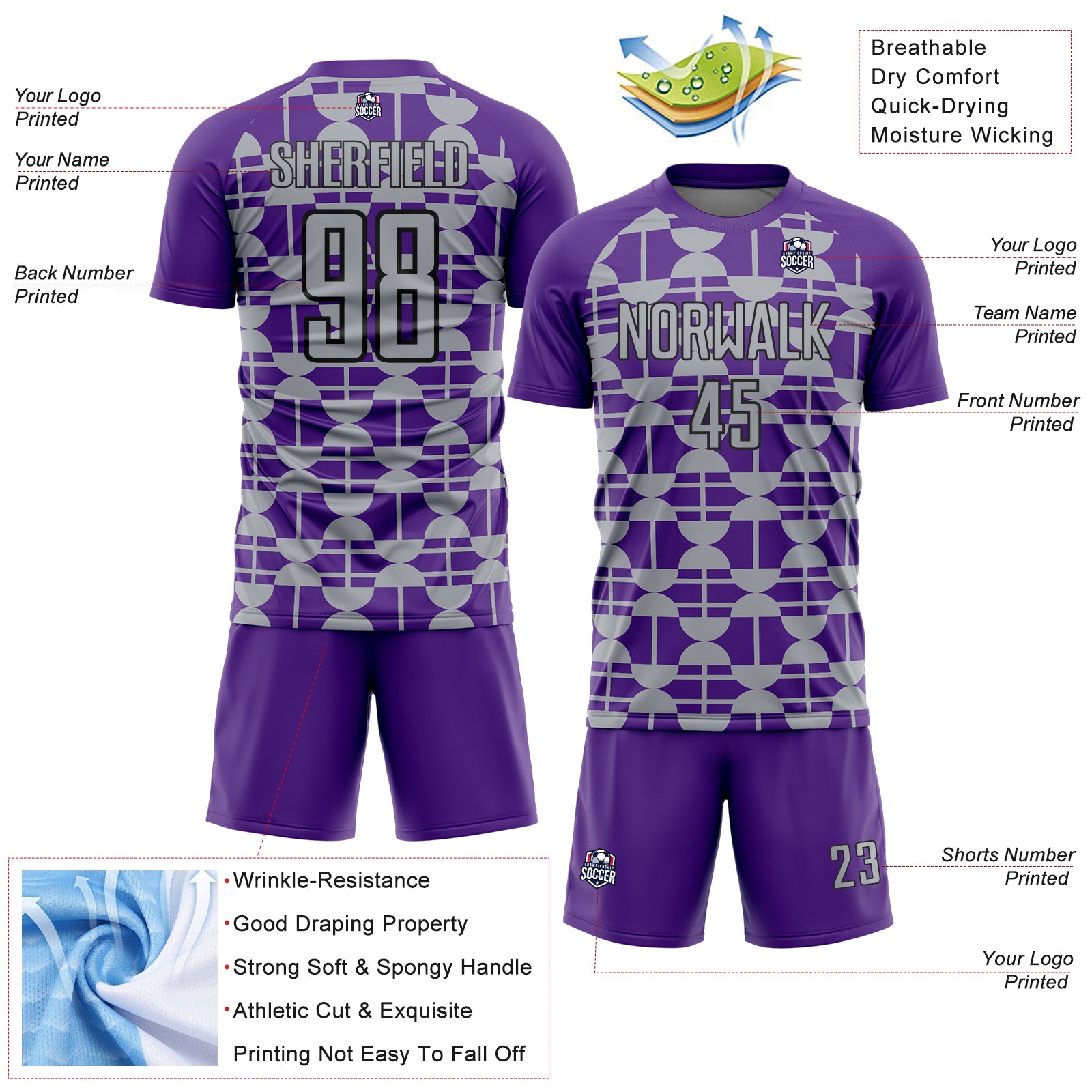 Custom Purple Gray-Black Geometric Shapes Sports Sublimation Soccer Uniform Jersey