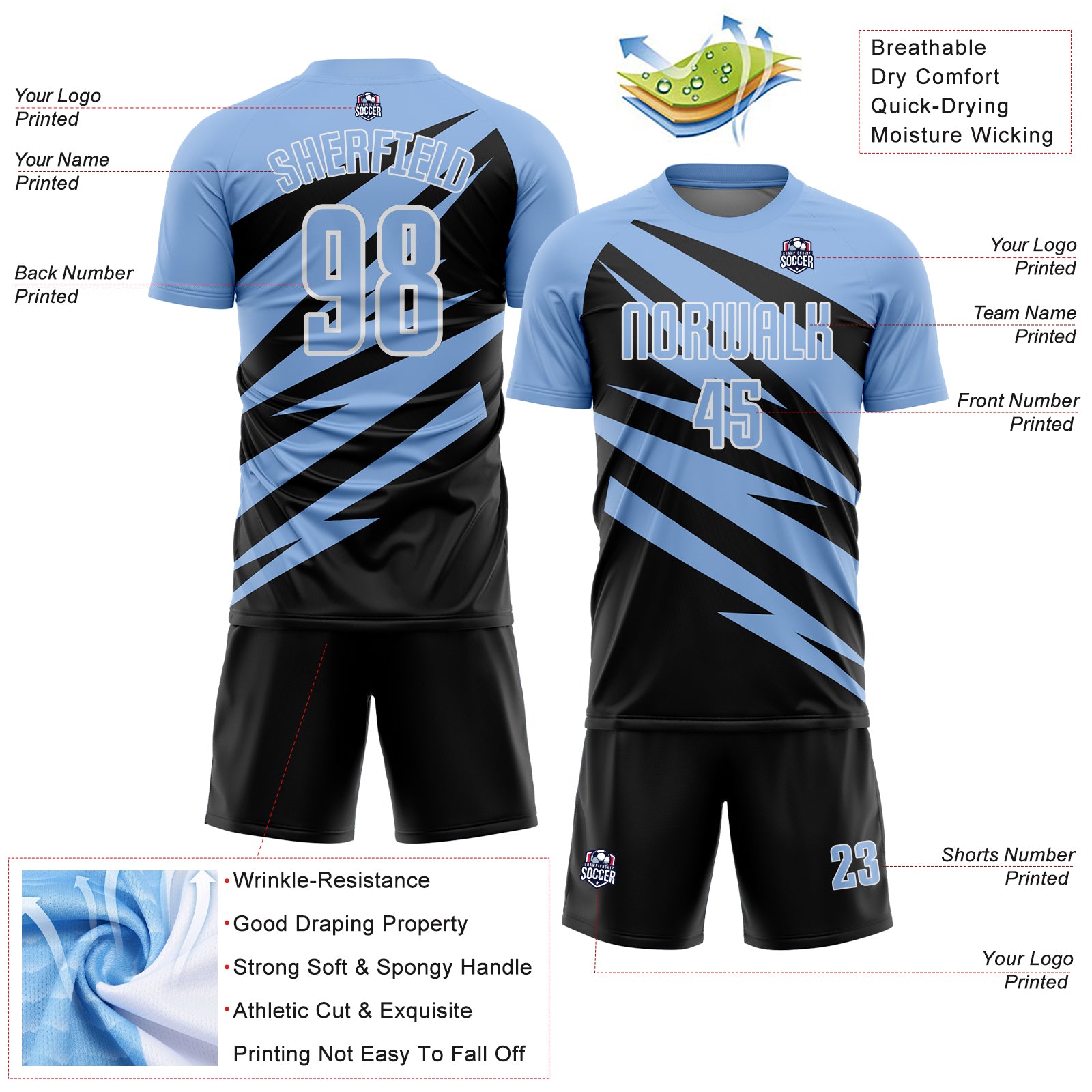 Custom Light Blue Black-White Abstract Line Sports Sublimation Soccer Uniform Jersey