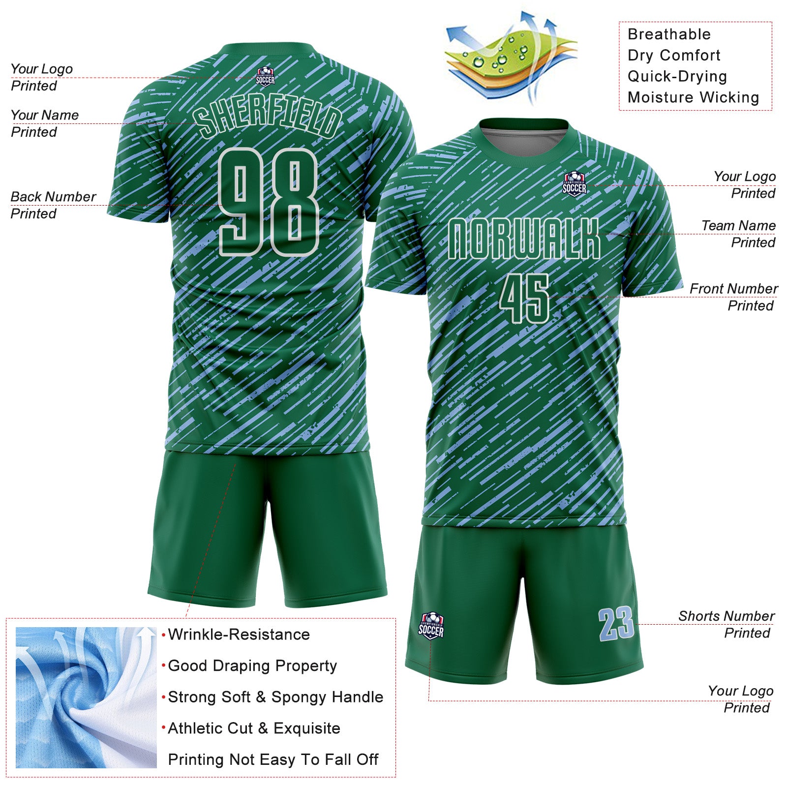 Custom Kelly Green Light Blue-White Line Sports Sublimation Soccer Uniform Jersey
