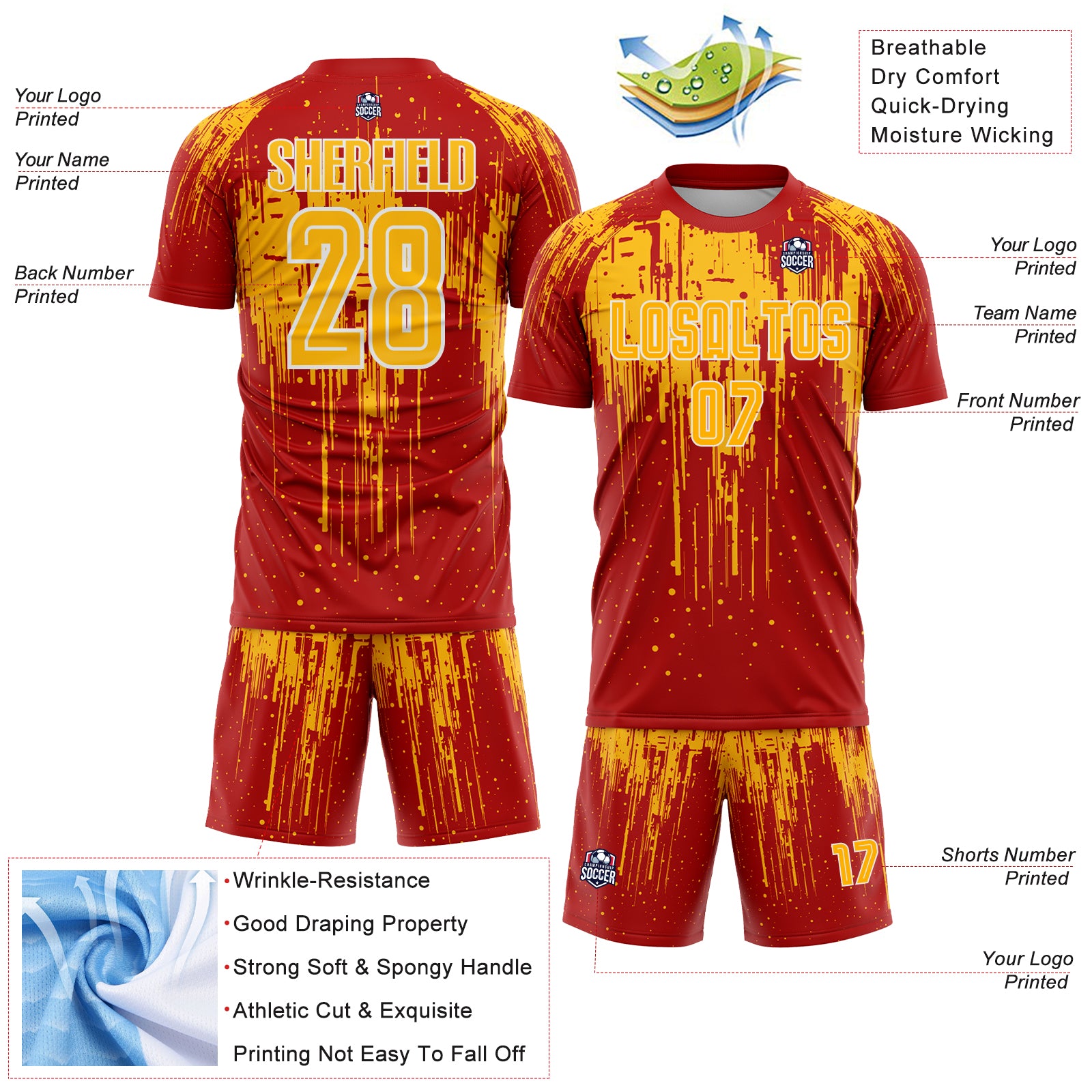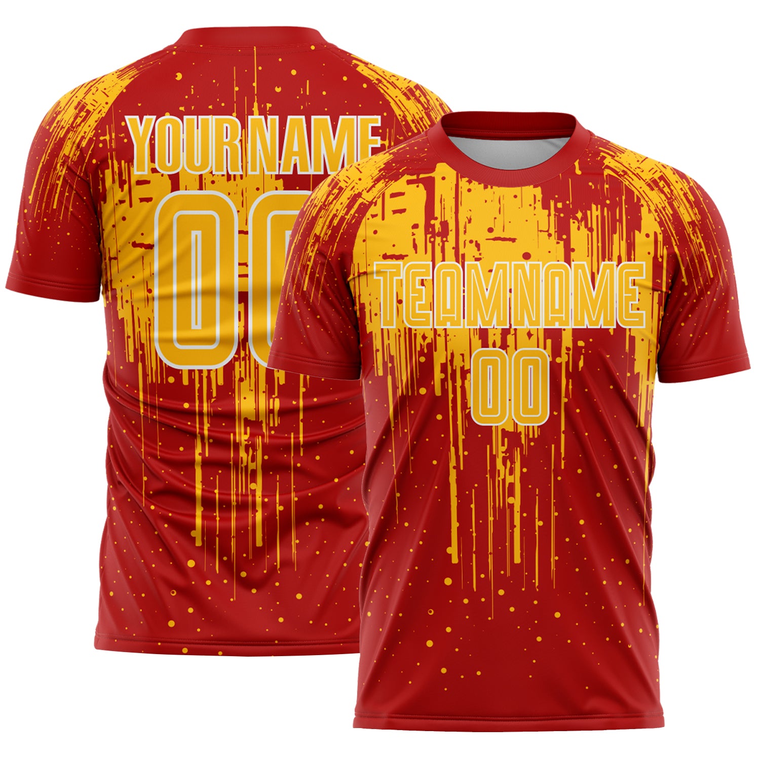 Custom Red Gold-White Dripping Splatte Pattern Sports Sublimation Soccer Uniform Jersey