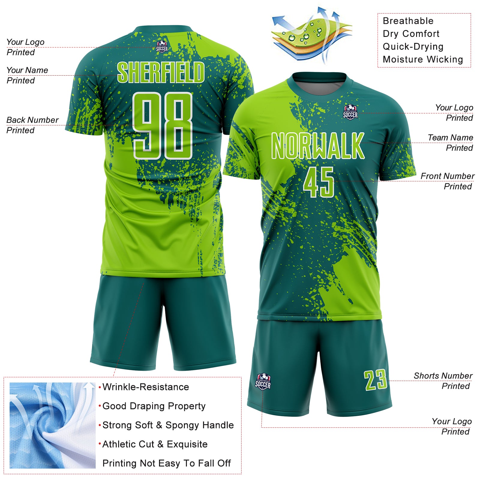 Custom Teal Neon Green-White Abstract Brush Stroke Sports Sublimation Soccer Uniform Jersey