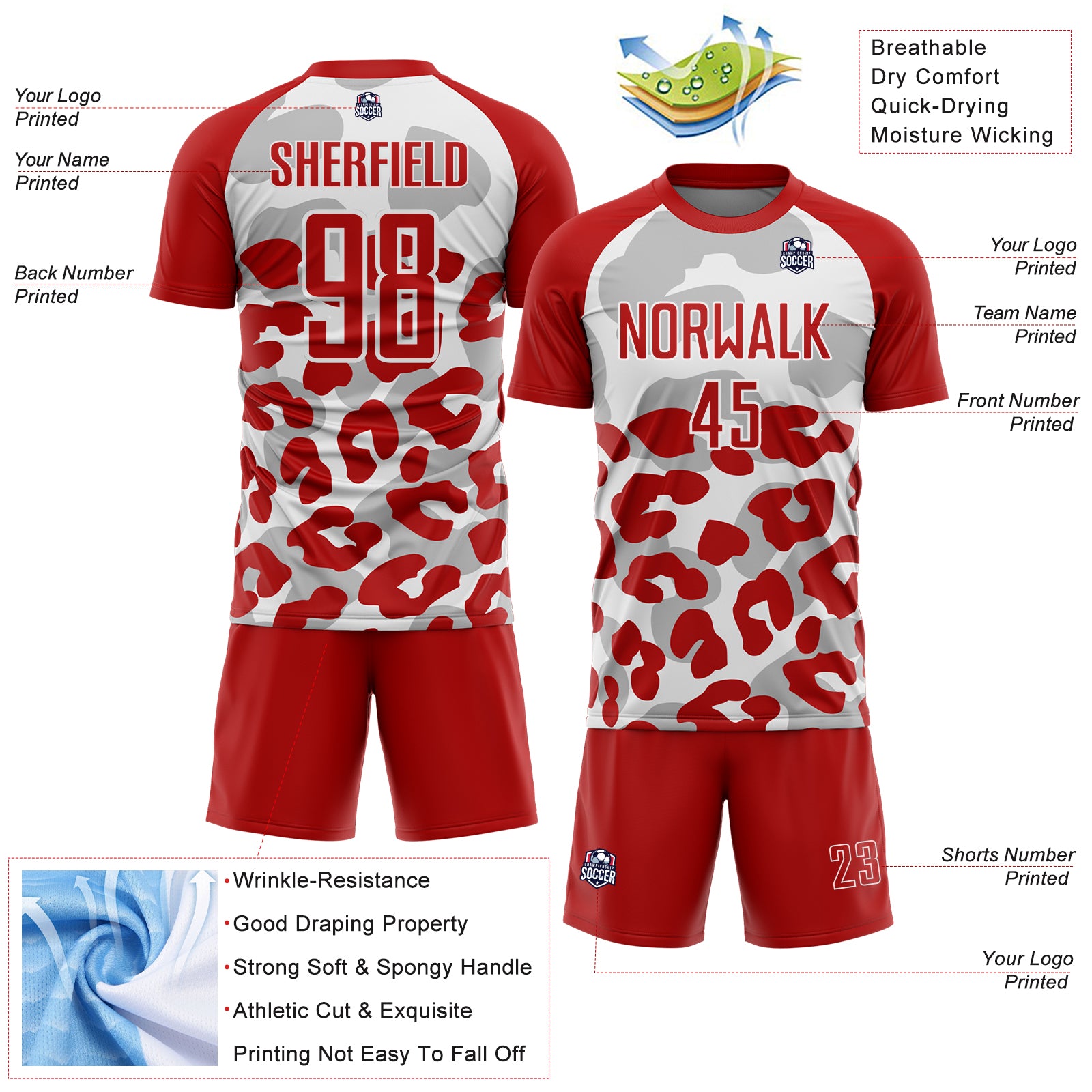 Custom Red White Animal Leopard Print Sports Sublimation Soccer Uniform Jersey
