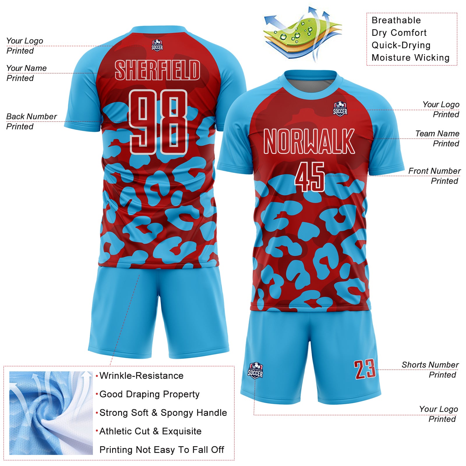 Custom Sky Blue Red-White Animal Leopard Print Sports Sublimation Soccer Uniform Jersey