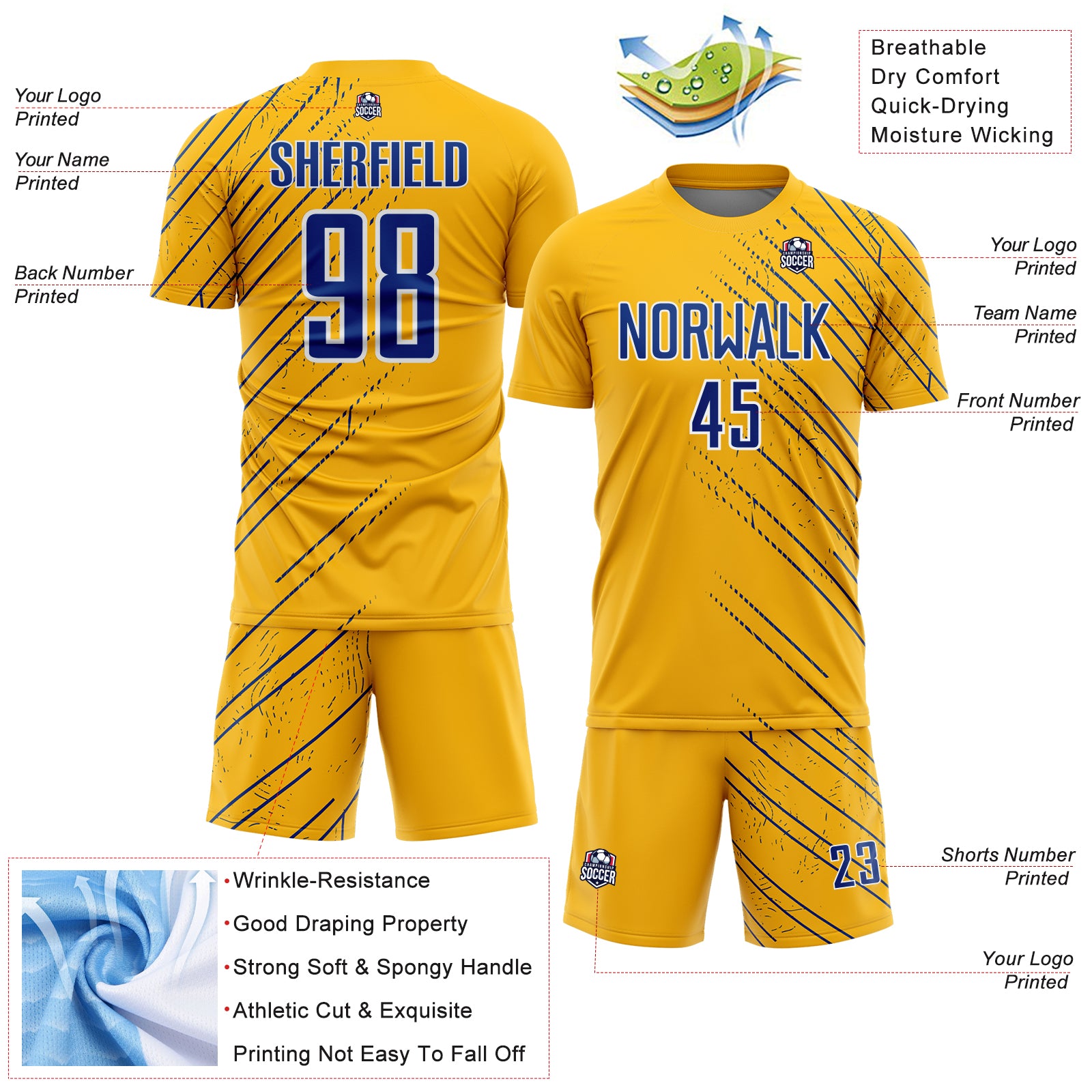 Custom Gold Royal-White Lines Sports Sublimation Soccer Uniform Jersey