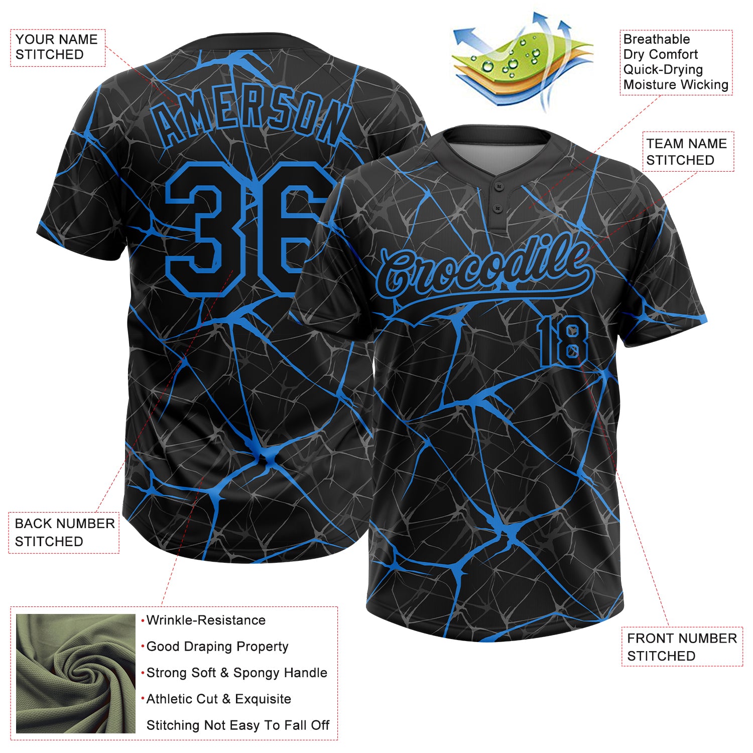 Custom Black Electric Blue 3D Pattern Design Abstract Network Two-Button Unisex Softball Jersey