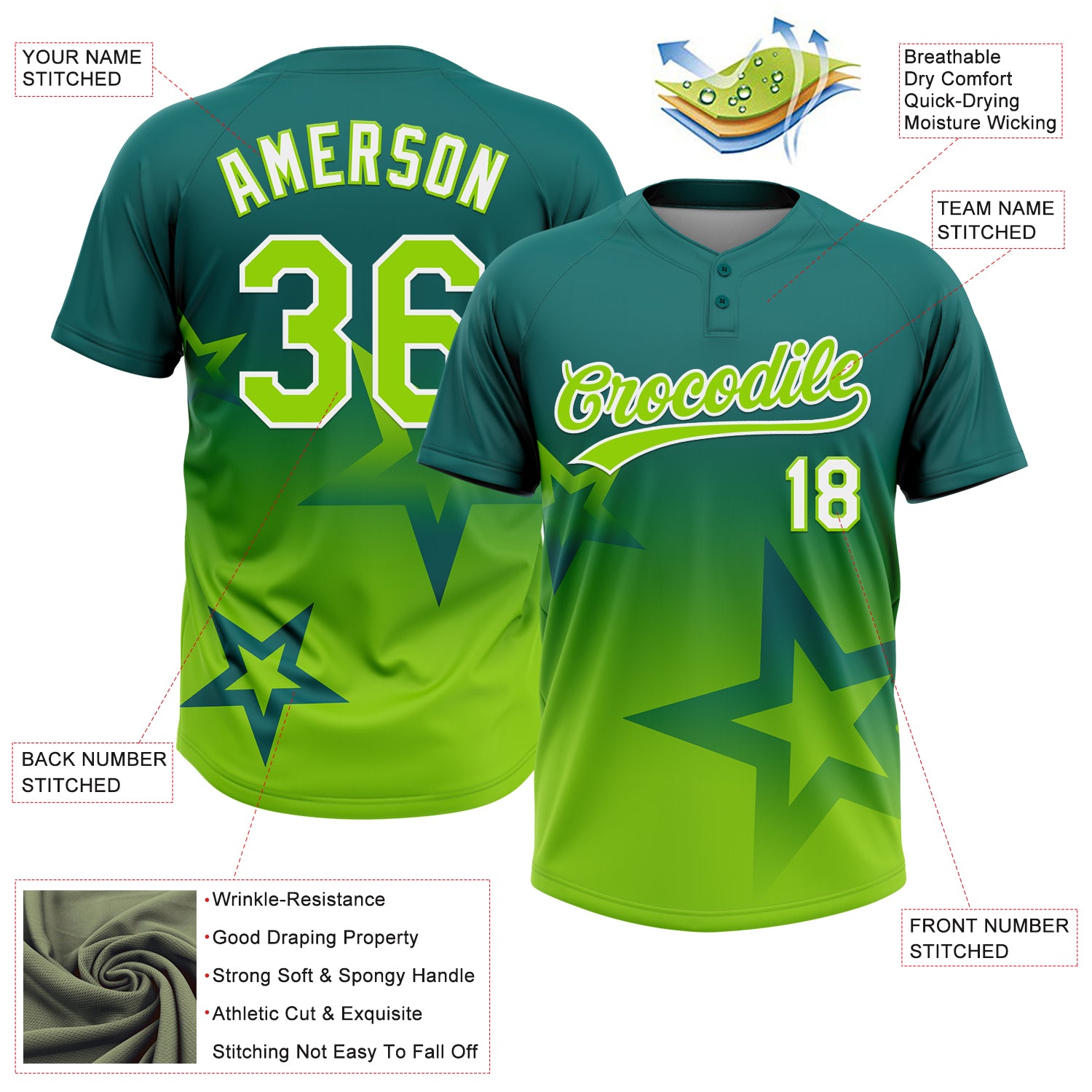 • Laden Sie das Bild in den Galerie-Viewer, Custom Teal Neon Green-White Gradient Style Twinkle Star Two-Button Unisex Softball Jersey