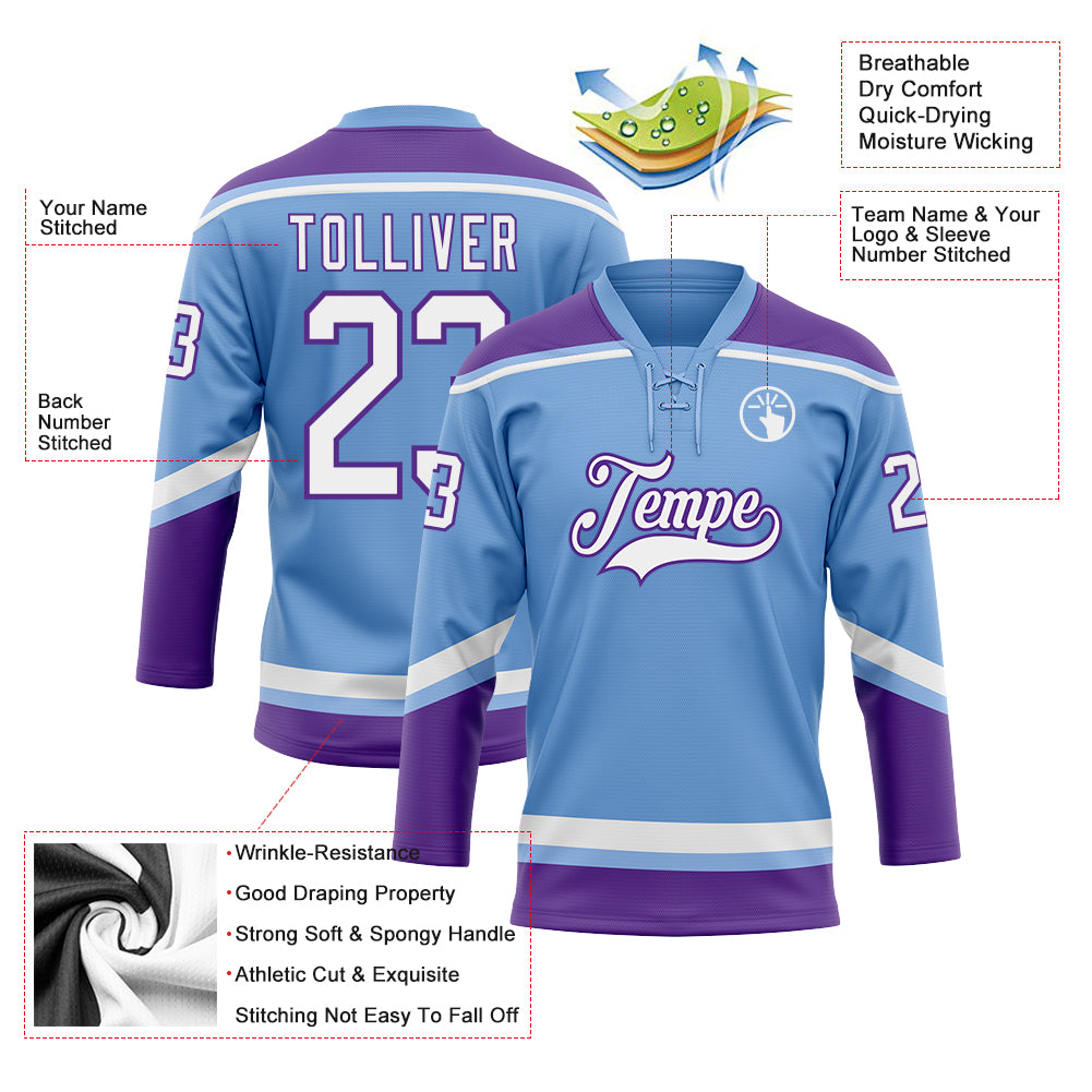 Custom Light Blue White-Purple Hockey Lace Neck Jersey