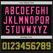 • Laden Sie das Bild in den Galerie-Viewer, Custom Black Pink Pinstripe Neon Green Bomber Full-Snap Varsity Letterman Jacket