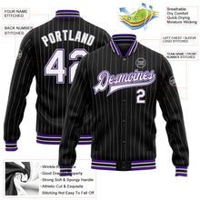 • Laden Sie das Bild in den Galerie-Viewer, Custom Black Gray Pinstripe White-Purple Bomber Full-Snap Varsity Letterman Jacket
