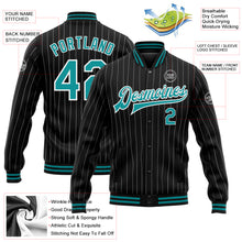 • Laden Sie das Bild in den Galerie-Viewer, Custom Black White Pinstripe Teal Bomber Full-Snap Varsity Letterman Jacket