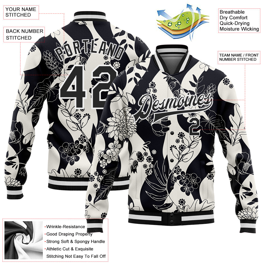Custom Black White Floral Wave 3D Pattern Design Bomber Full-Snap Varsity Letterman Jacket