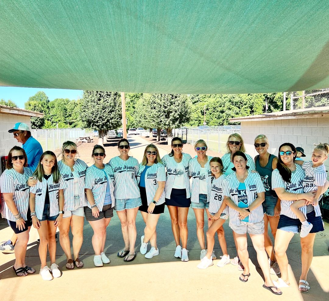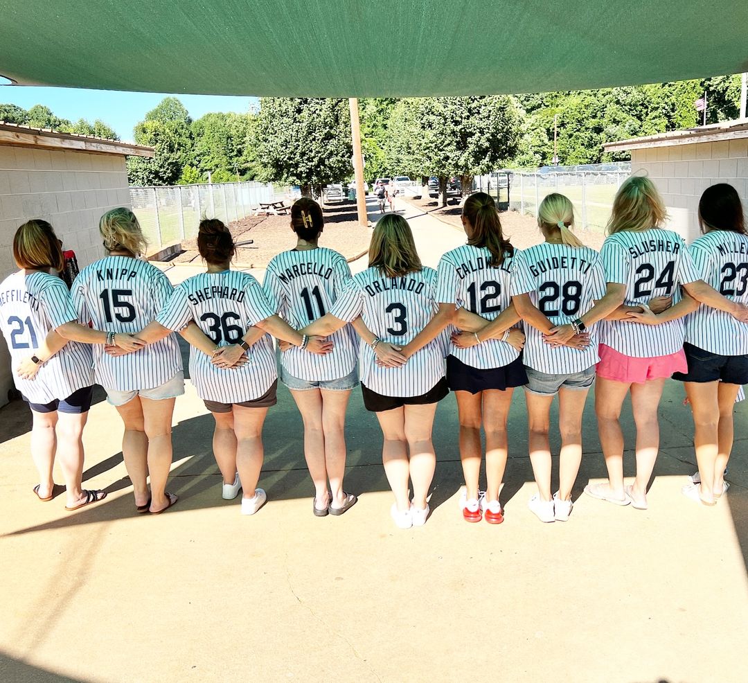 Women's team wearing White Pinstripe custom baseball jerseys paired with shorts and sunglasses