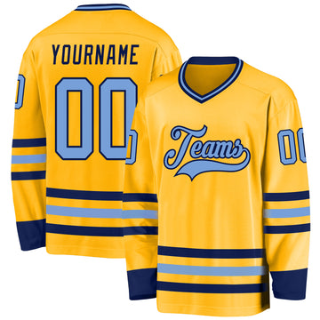 Customized hockey gold jerseys have a wide and diverse range of usage scenarios. Here are some common scenarios and their matching suggestions: Usage scenarios: Formal matches: In ice hockey leagues or tournaments, teams usually wear a unified customized jersey to demonstrate team cohesion and professionalism. These jerseys are usually exquisitely designed, brightly colored, with the team emblem and player names printed on them. Friendship matches and training: In friendship matches or daily training, teams may also wear customized jerseys to facilitate identification between teammates and reflect team spirit. These jerseys may be relatively simple, but they still reflect the team's characteristics. School and club activities: School or club ice hockey teams may also choose custom hockey gold jerseys to showcase their identity and team culture. These jerseys are usually combined with school or club logos to showcase a unique style. Special events: When celebrating specific holidays, anniversaries, or hosting special events, teams may choose custom hockey gold jerseys to highlight the theme and atmosphere of the event. Suggested color matching: The color of the jersey should match the team's logo and theme, while considering the visual effect of the player on the ice, a bright and high contrast color combination can be selected. Accessories and Details: Details such as team emblem, player name, and number can be added to the hockey gold jerseys to highlight the personality of the team and players. Meanwhile, suitable collar, cuffs, and hem designs can be chosen to enhance the aesthetics and comfort of the jersey. Protective gear and equipment: Matching protective gear and equipment with custom hockey jerseys is also crucial. The leg guards, elbows, helmets, etc. should be coordinated with the style of the jersey to form a unified visual effect. Socks and shoes: Players' socks and shoes are also part of their overall attire. You can choose socks that match the color of the jersey, as well as professional ice hockey shoes, to ensure the comfort and safety of players during the game. Accessories and props: In special occasions or events, it is also possible to consider adding some accessories and props, such as scarves, hats, gloves, etc., to increase the richness and fun of the overall design. In short, there are various usage scenarios and flexible matching methods for customizing ice hockey jerseys. The key lies in selecting appropriate colors, details, and accessories based on the characteristics and needs of the team, in order to showcase the unique charm and team spirit of the team. Warm Custom Gold Hockey Jerseys: Gold Light Blue, Gold Red, Gold Black, Gold Navy, Gold Royal, Gold Brown, Gold Green, Gold Kelly Green, Gold Purple, Gold Vintage USA Flag, Gold White