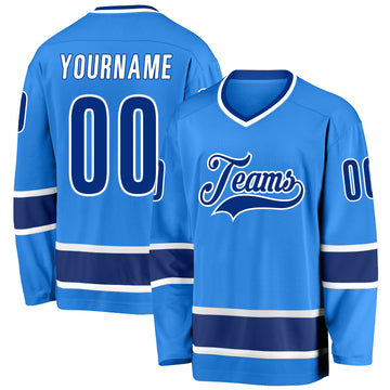 Customized hockey powder blue jerseys have a wide and diverse range of usage scenarios. Here are some common scenarios and their matching suggestions: Usage scenarios: Formal matches: In ice hockey leagues or tournaments, teams usually wear a unified customized jersey to demonstrate team cohesion and professionalism. These jerseys are usually exquisitely designed, brightly colored, with the team emblem and player names printed on them. Friendship matches and training: In friendship matches or daily training, teams may also wear customized jerseys to facilitate identification between teammates and reflect team spirit. These jerseys may be relatively simple, but they still reflect the team's characteristics. School and club activities: School or club ice hockey teams may also choose custom hockey powder blue jerseys to showcase their identity and team culture. These jerseys are usually combined with school or club logos to showcase a unique style. Special events: When celebrating specific holidays, anniversaries, or hosting special events, teams may choose custom hockey powder blue jerseys to highlight the theme and atmosphere of the event. Suggested color matching: The color of the jersey should match the team's logo and theme, while considering the visual effect of the player on the ice, a bright and high contrast color combination can be selected. Accessories and Details: Details such as team emblem, player name, and number can be added to the hockey powder blue jerseys to highlight the personality of the team and players. Meanwhile, suitable collar, cuffs, and hem designs can be chosen to enhance the aesthetics and comfort of the jersey. Protective gear and equipment: Matching protective gear and equipment with custom hockey jerseys is also crucial. The leg guards, elbows, helmets, etc. should be coordinated with the style of the jersey to form a unified visual effect. Socks and shoes: Players' socks and shoes are also part of their overall attire. You can choose socks that match the color of the jersey, as well as professional ice hockey shoes, to ensure the comfort and safety of players during the game. Accessories and props: In special occasions or events, it is also possible to consider adding some accessories and props, such as scarves, hats, gloves, etc., to increase the richness and fun of the overall design. In short, there are various usage scenarios and flexible matching methods for customizing ice hockey jerseys. The key lies in selecting appropriate colors, details, and accessories based on the characteristics and needs of the team, in order to showcase the unique charm and team spirit of the team. Warm Custom Powder Blue Hockey Jerseys: Powder Blue Navy, Powder Blue Gold, Powder Blue Orange, Powder Blue Red, Powder Blue Royal, Powder Blue Pink, Powder Blue Black, Powder Blue White, Powder Blue Kelly Green, , , , , ,