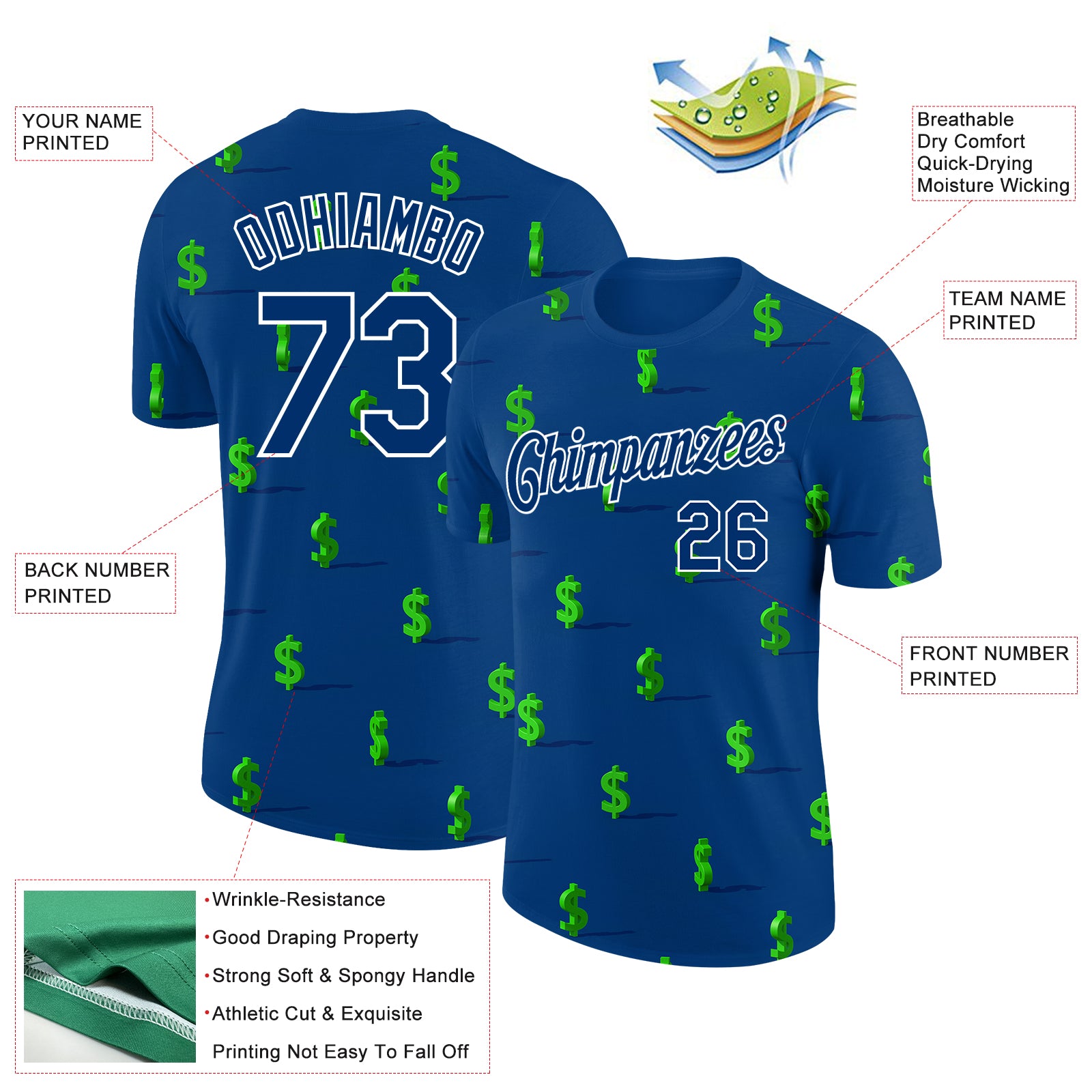 Custom US Navy Blue White 3D Pattern Design Dollar Sign Money Theme Performance T-Shirt