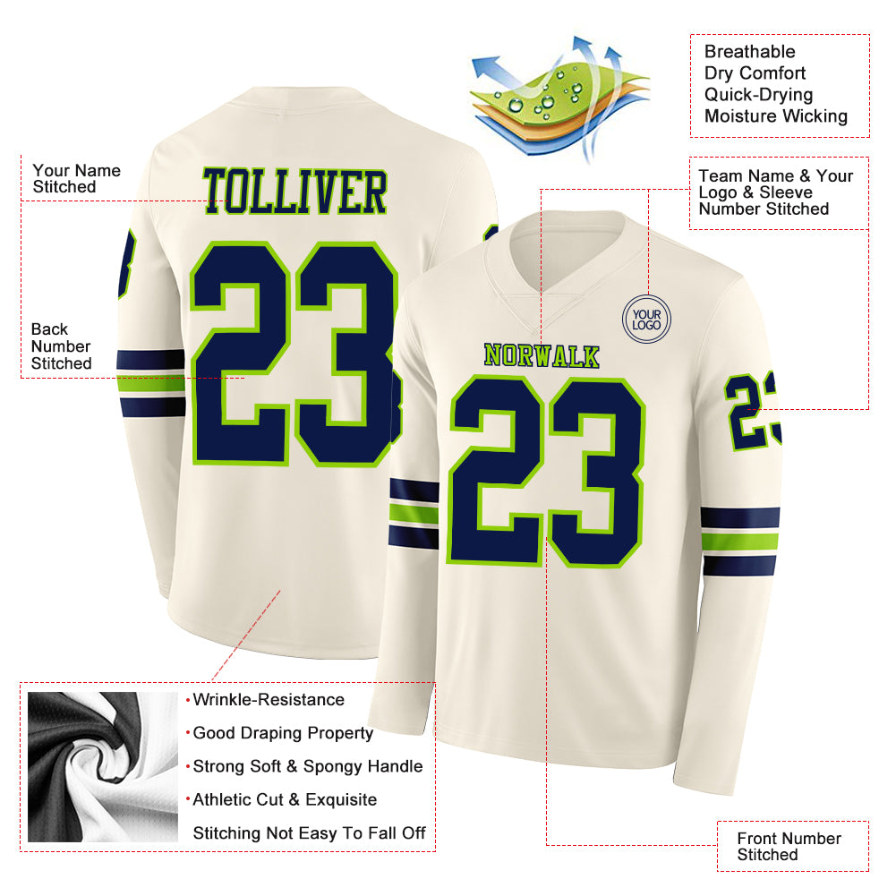Custom Cream Navy-Neon Green Long Sleeve Authentic Football Jersey