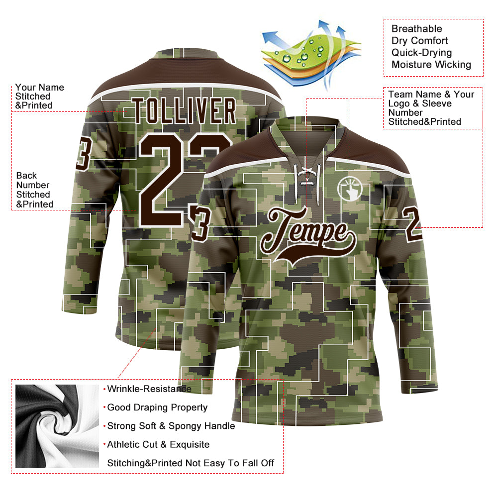 Custom Camo Brown-White 3D Camouflage Pixel Hockey Lace Neck Jersey