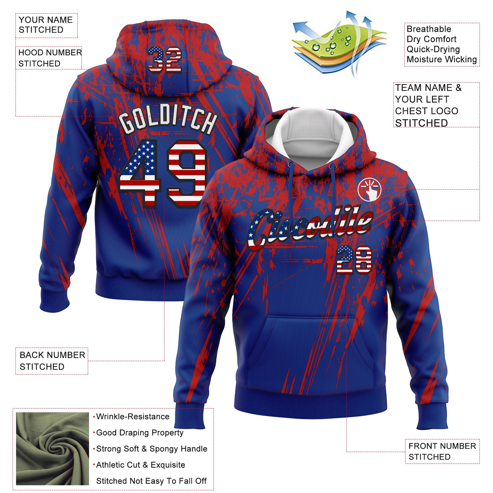 Custom Stitched Royal USA Flag Red Black-White 3D Pattern Design Splash Grunge Art Sports Pullover Sweatshirt Hoodie