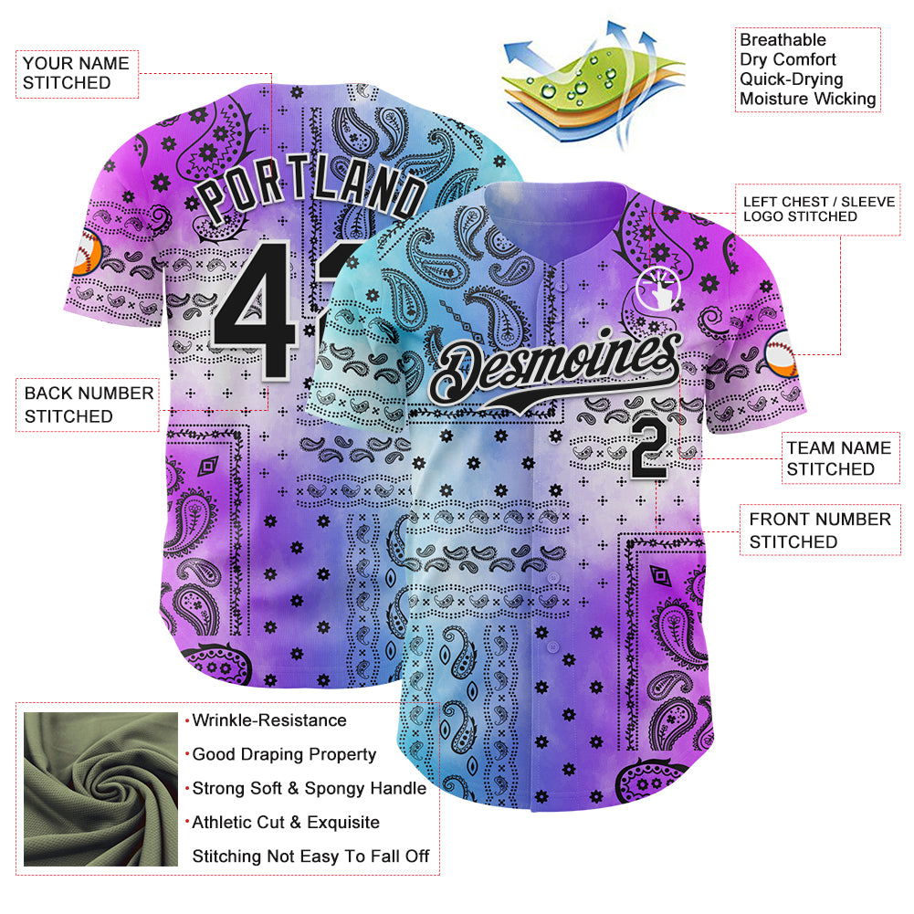 Custom Purple Black Blue-White 3D Pattern Design Gradient Rave Party Ethnic Paisley Bandana Authentic Baseball Jersey
