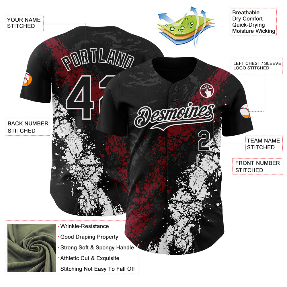 Custom Black Crimson-White 3D Pattern Design Splash Authentic Baseball Jersey