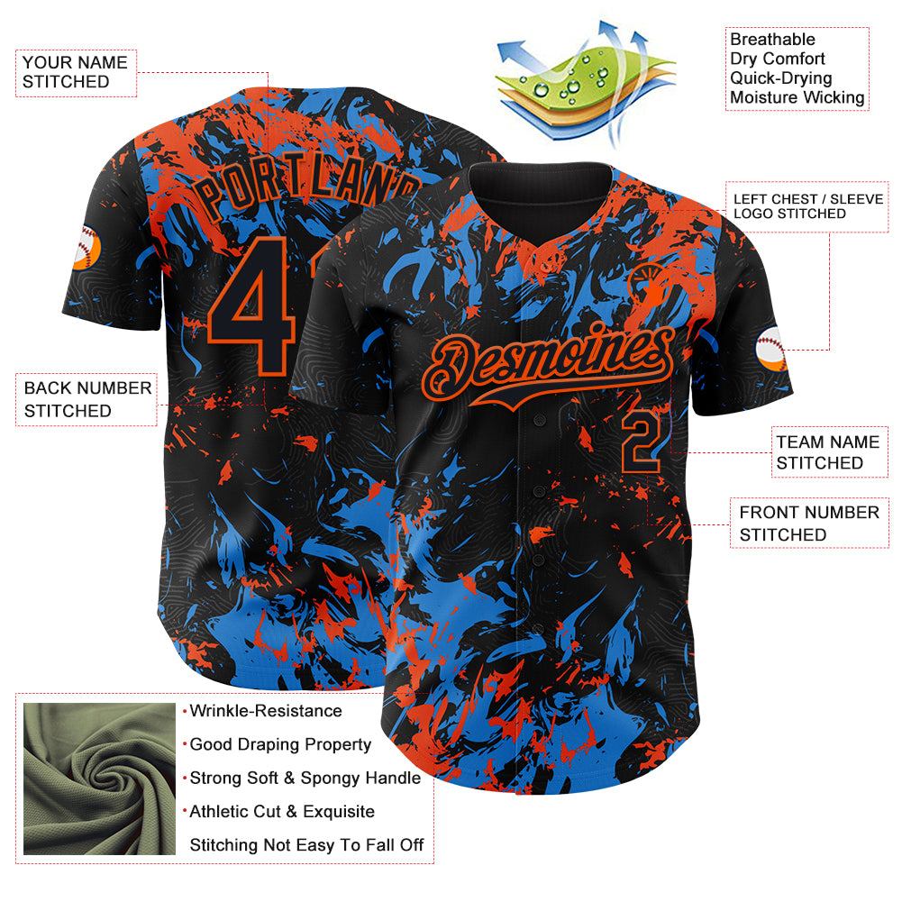 Custom Black Electric Blue-Orange 3D Pattern Design Splash Authentic Baseball Jersey
