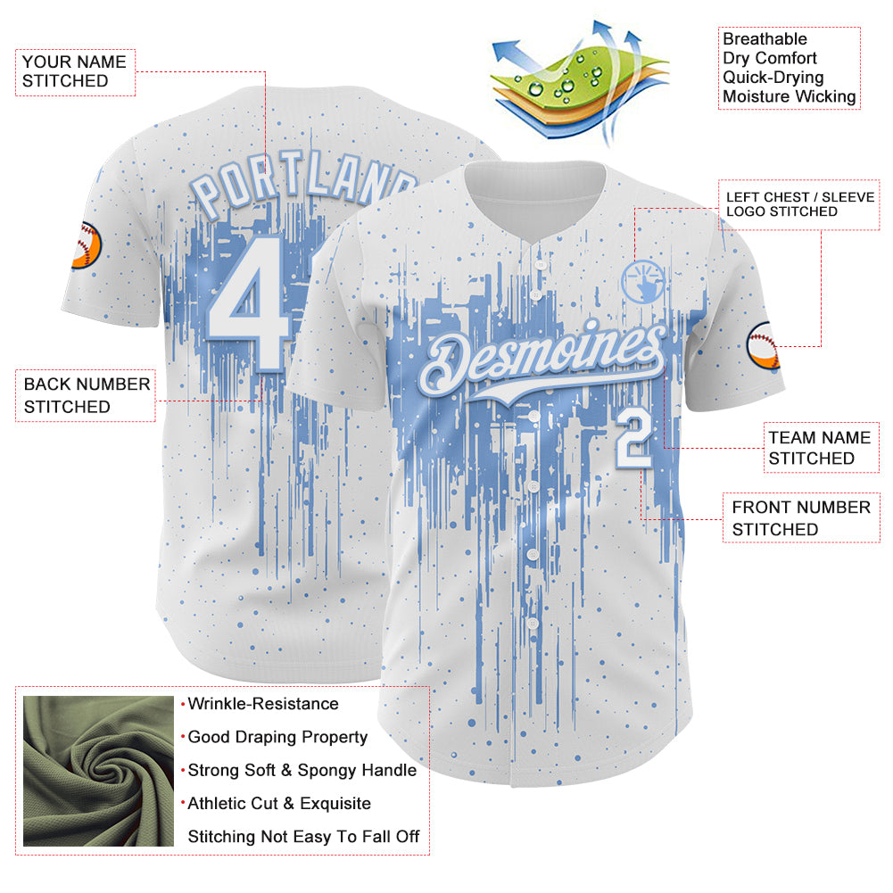 Custom White Light Blue 3D Pattern Design Dripping Splatter Paint Authentic Baseball Jersey