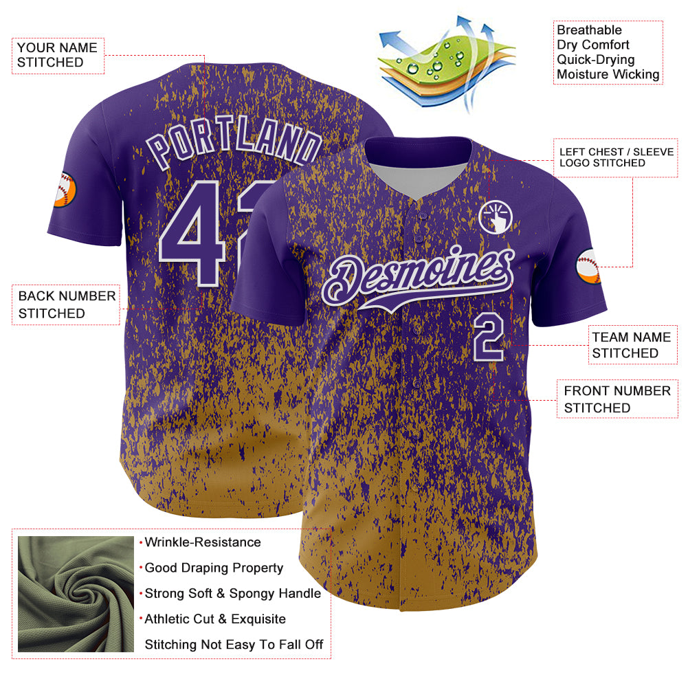 Custom Purple Old Gold-White 3D Pattern Design Abstract Fragment Splatter Authentic Baseball Jersey