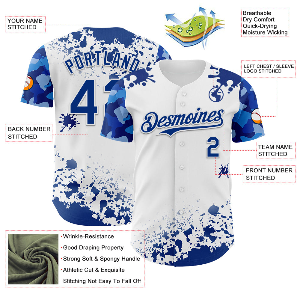 Custom White Royal Splatter Camo Two Tone Authentic Baseball Jersey