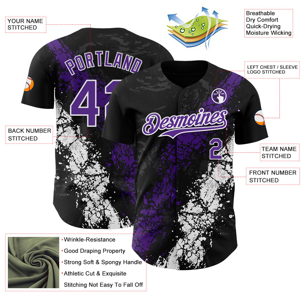Custom Black Purple-White 3D Pattern Design Splash Authentic Baseball Jersey