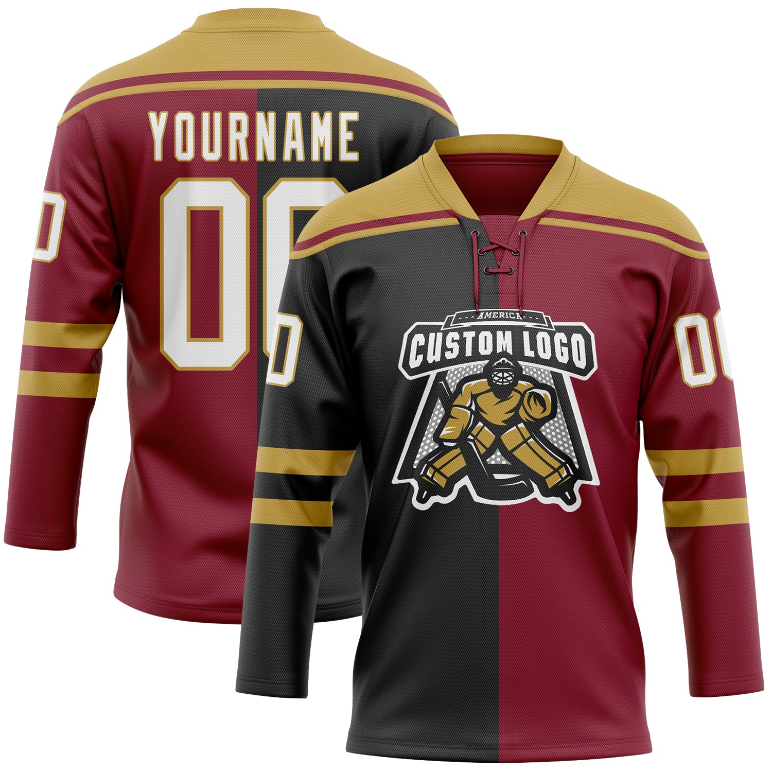 Custom Crimson White Black-Old Gold Split Fashion Hockey Lace Neck Jersey
