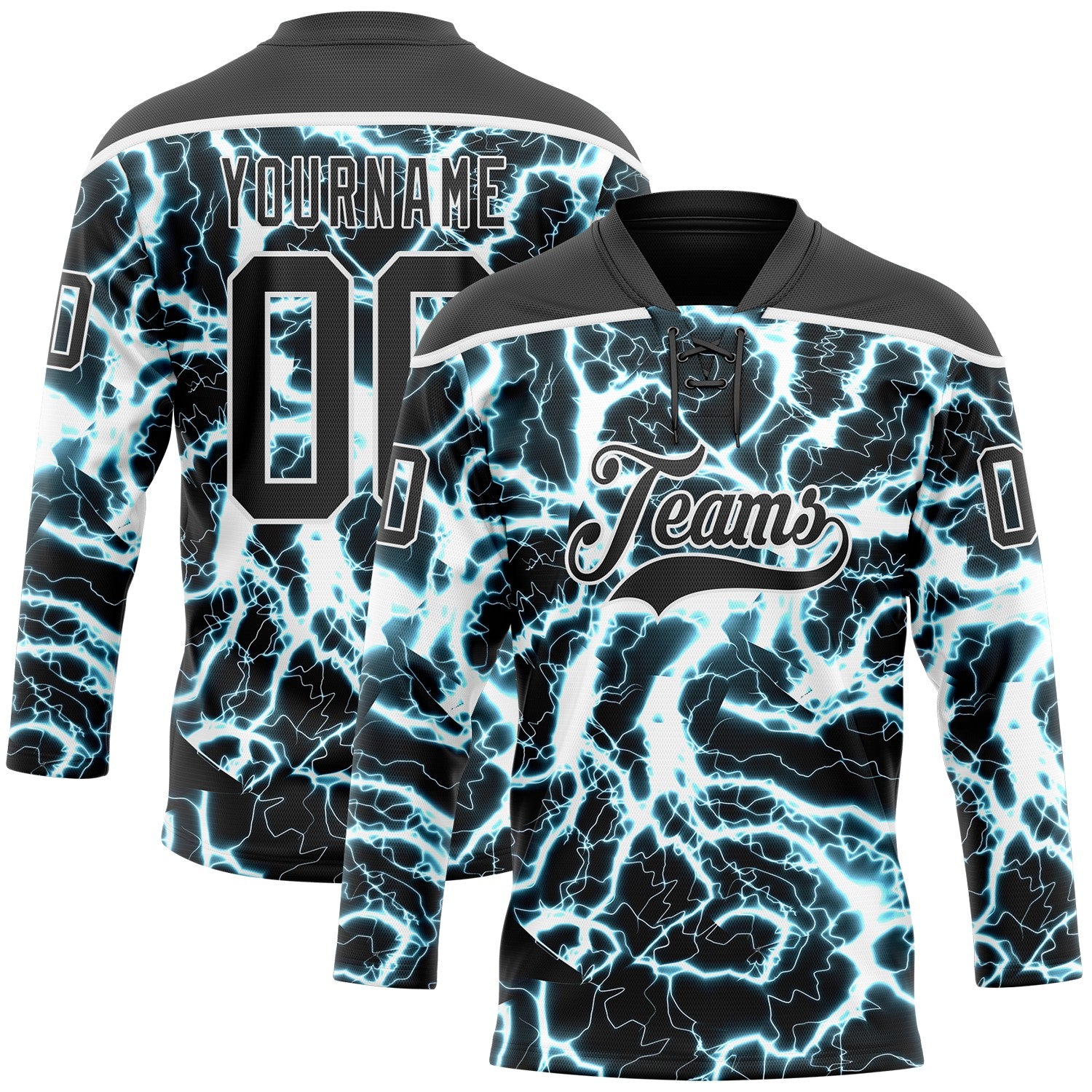 Custom Black Blue-White 3D Pattern Lightning Hockey Lace Neck Jersey